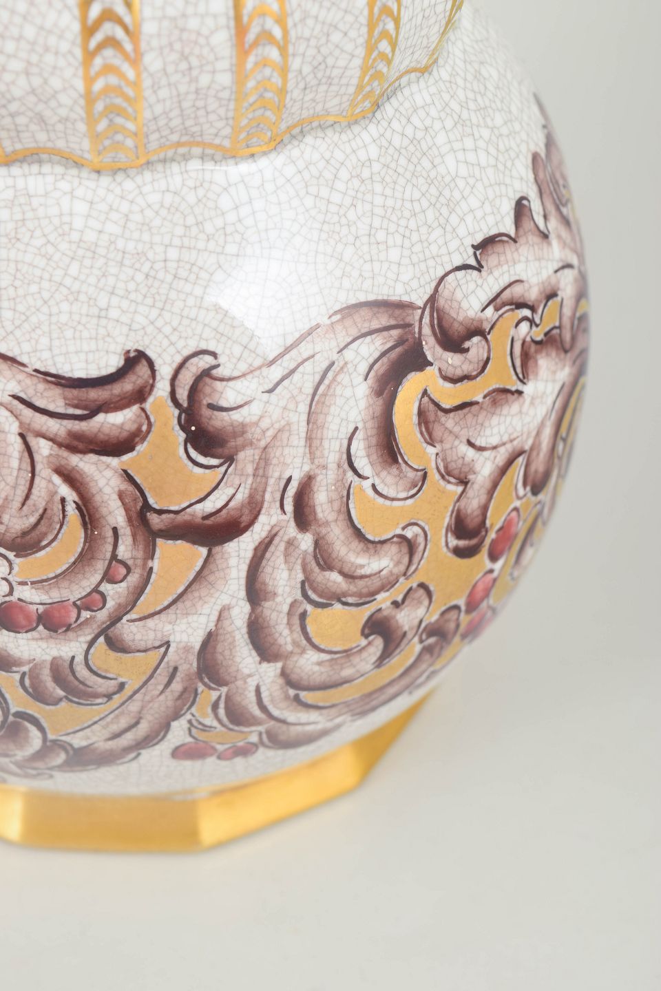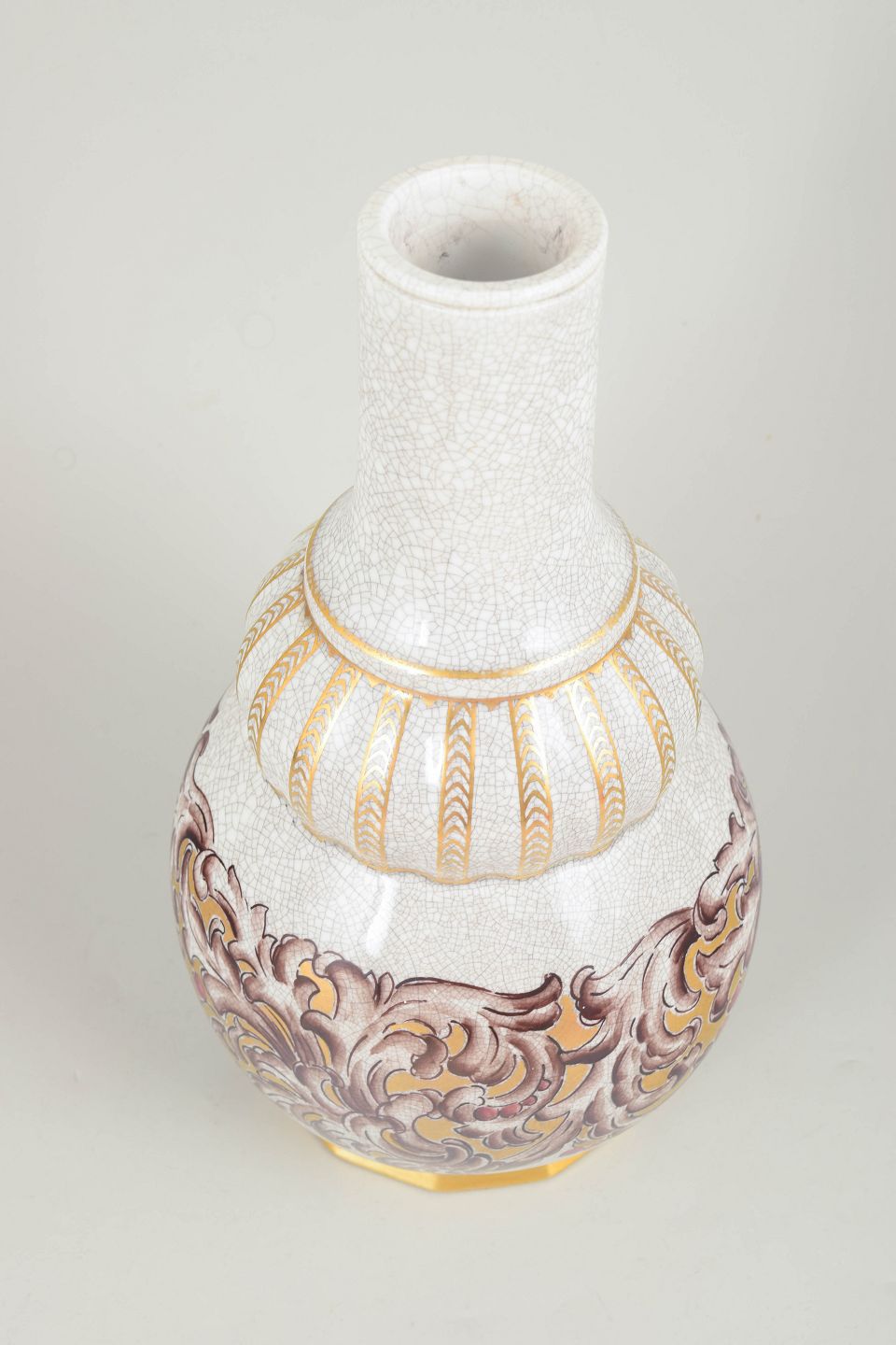 Dahl-Jensen art deco porcelænsvase.Elegant porcelænsvase med høj slank hals og balusterformet korpus dekoreret med reliefagtige ornamenter i guld og polykrome toner mod en krakeleret glasur. Formen og dekorationen afspejler den dekorative stil fra art deco-perioden. Modelnummer 133/320, stemplet Dahl-Jensen København i bunden.