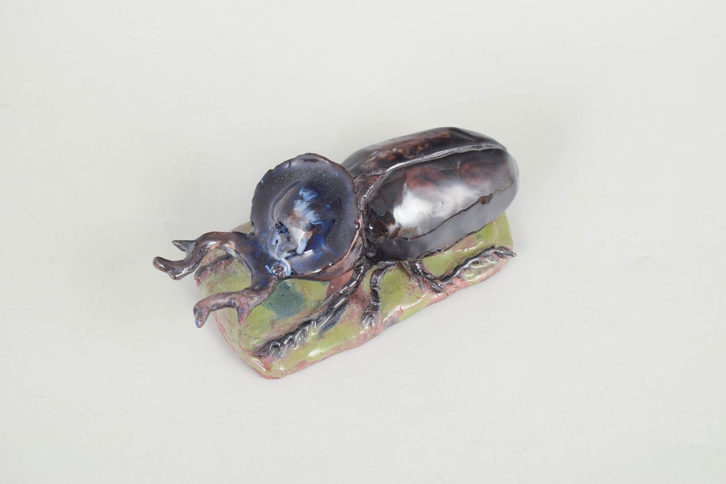 Nils-Erik Zetterström, insect figure.Unique ceramic sculpture depicting an insect executed in stoneware with glossy, iridescent glaze in dark blue, brown and green tonal nuances. The figure is modelled with naturalistic detailing and placed on a small clay base, giving the piece a lively and sculptural character. Signed and dated 1977.