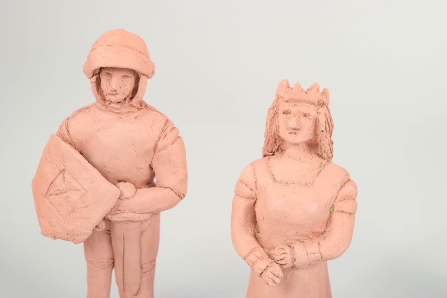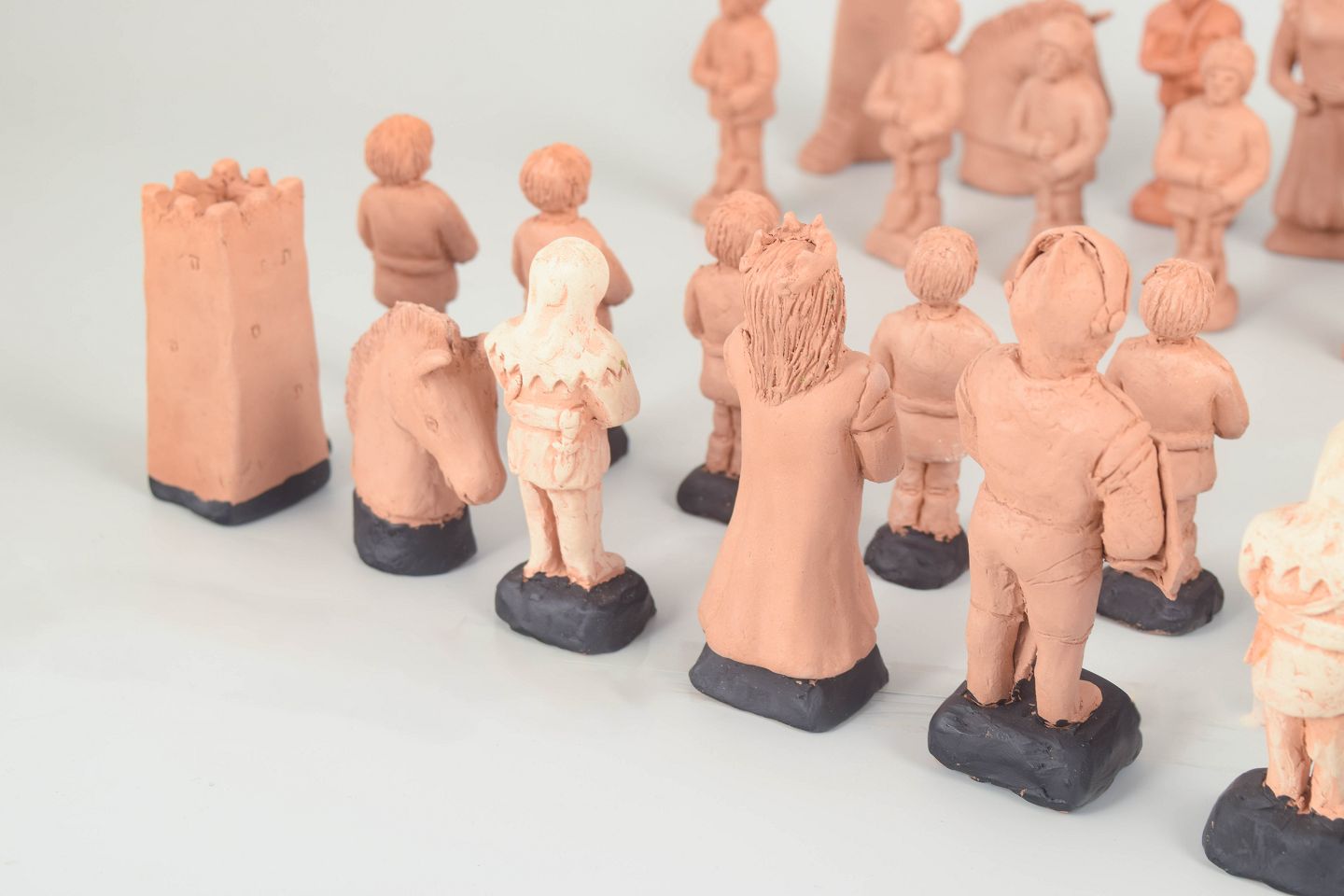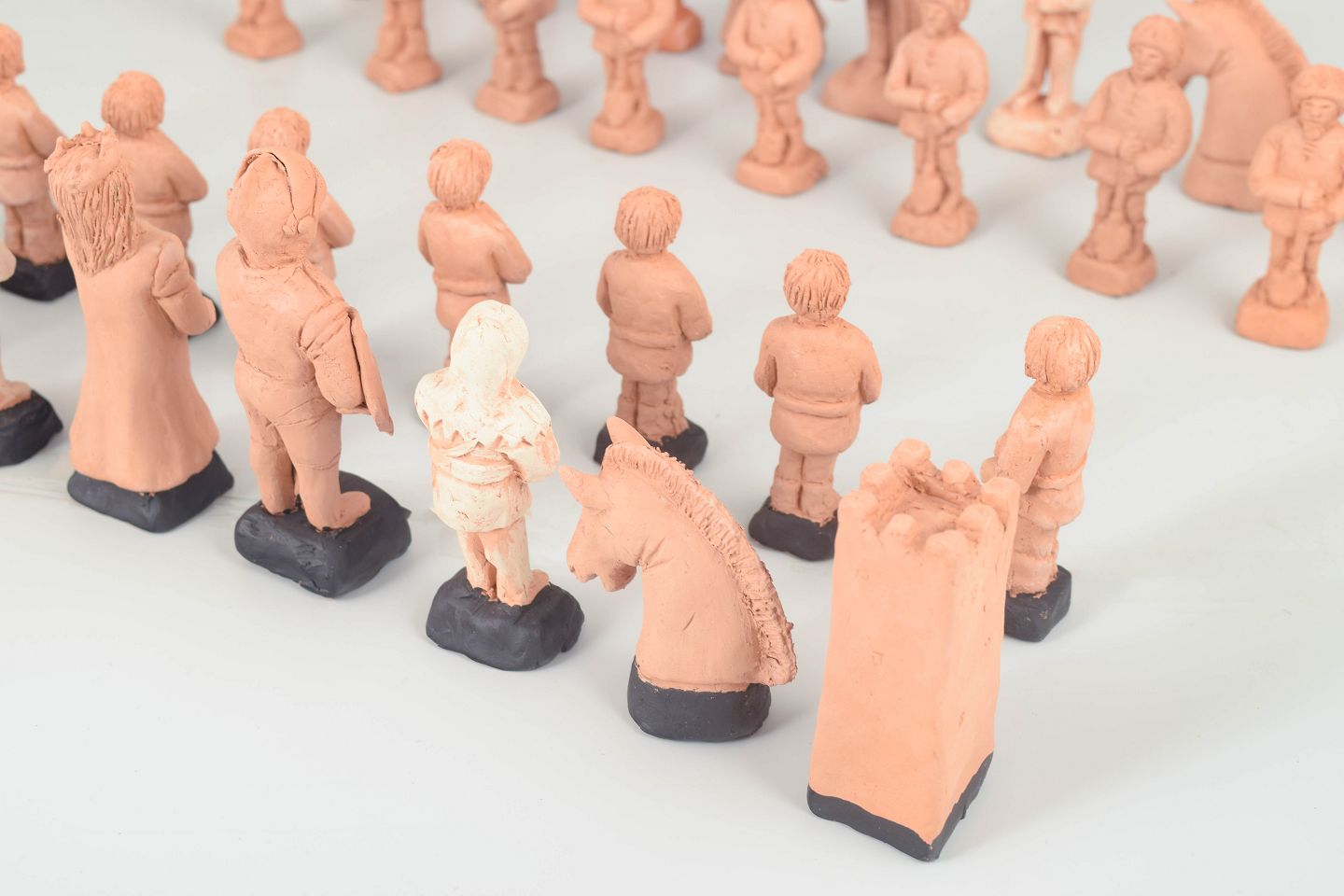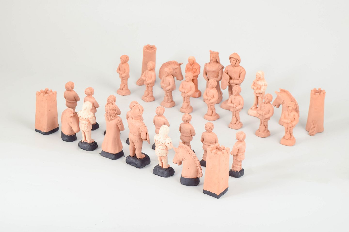 Nils-Erik Zetterström, chess set with figures.Unique ceramic chess set consisting of a complete set of thirty-two hand-modelled figures executed in unglazed clay. The pieces are designed as stylised human figures and sculptural forms, each with individual character and detailing. Several of the pieces are signed. The set presents an artistic interpretation of a chess game with a strong sculptural character. Created in 1959.