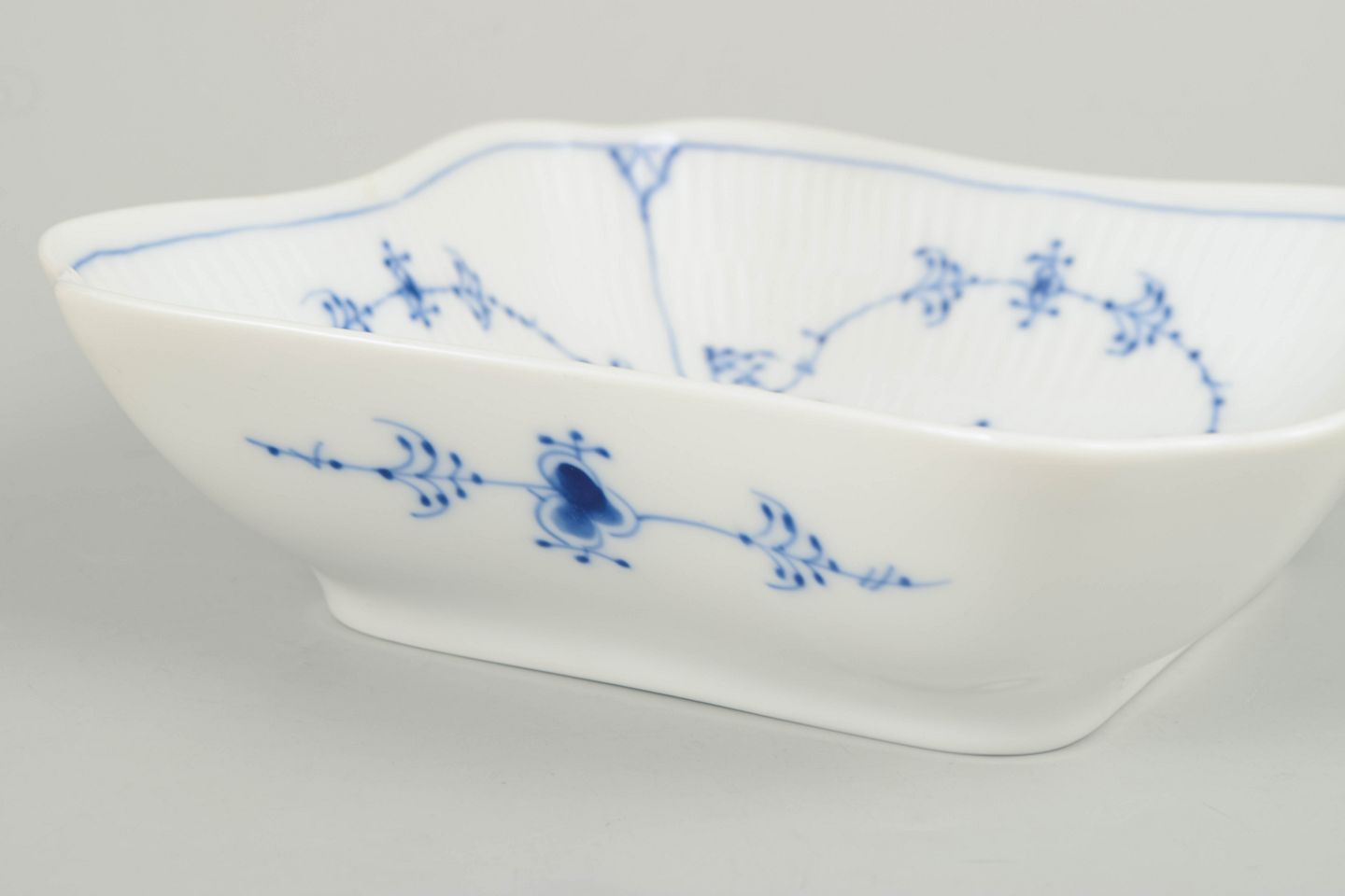 Royal Copenhagen Musselmalet Riflet, firkantet skål.Håndmalet porcelænsskål dekoreret med det klassiske musselmalede riflet mønster i blå underglasur. Skålen har en elegant firkantet form med let svungne sider og riflede detaljer i godset. Centralt ses det karakteristiske blomsterornament omgivet af slyngede blomstergrene. Undersiden er fabriksstemplet Royal Copenhagen, første sortering. Model 1/26.