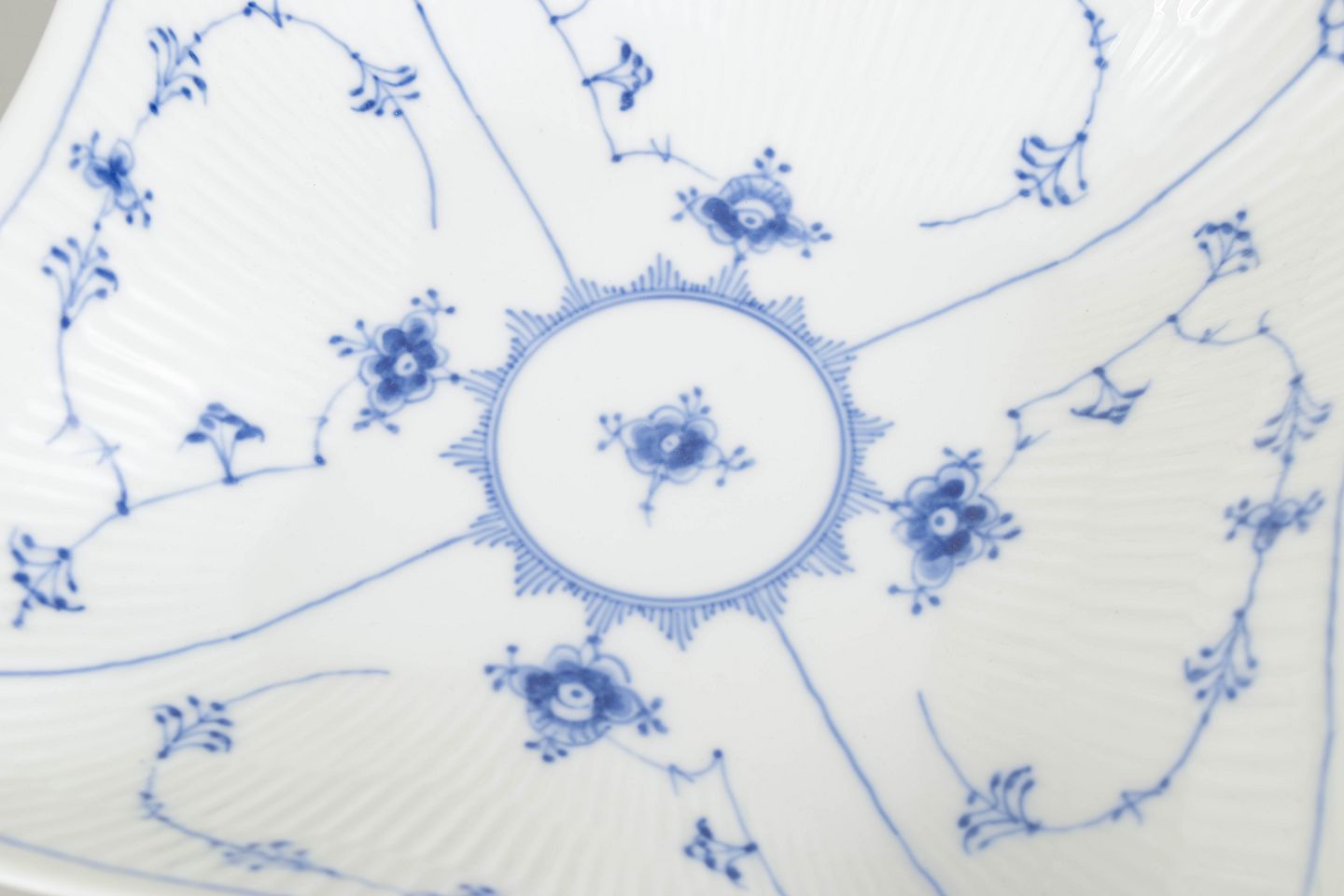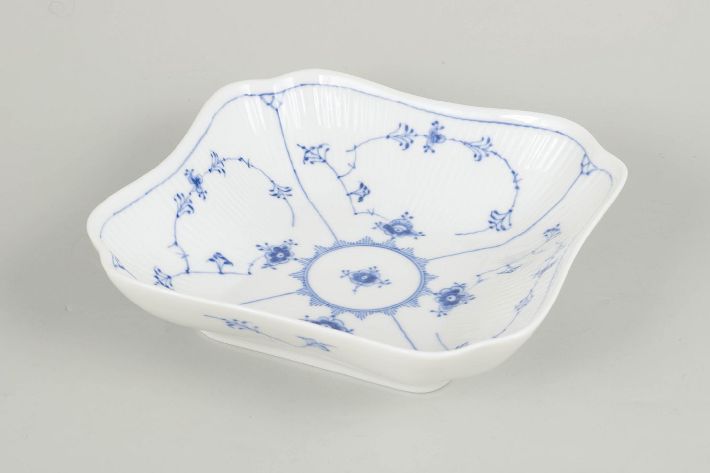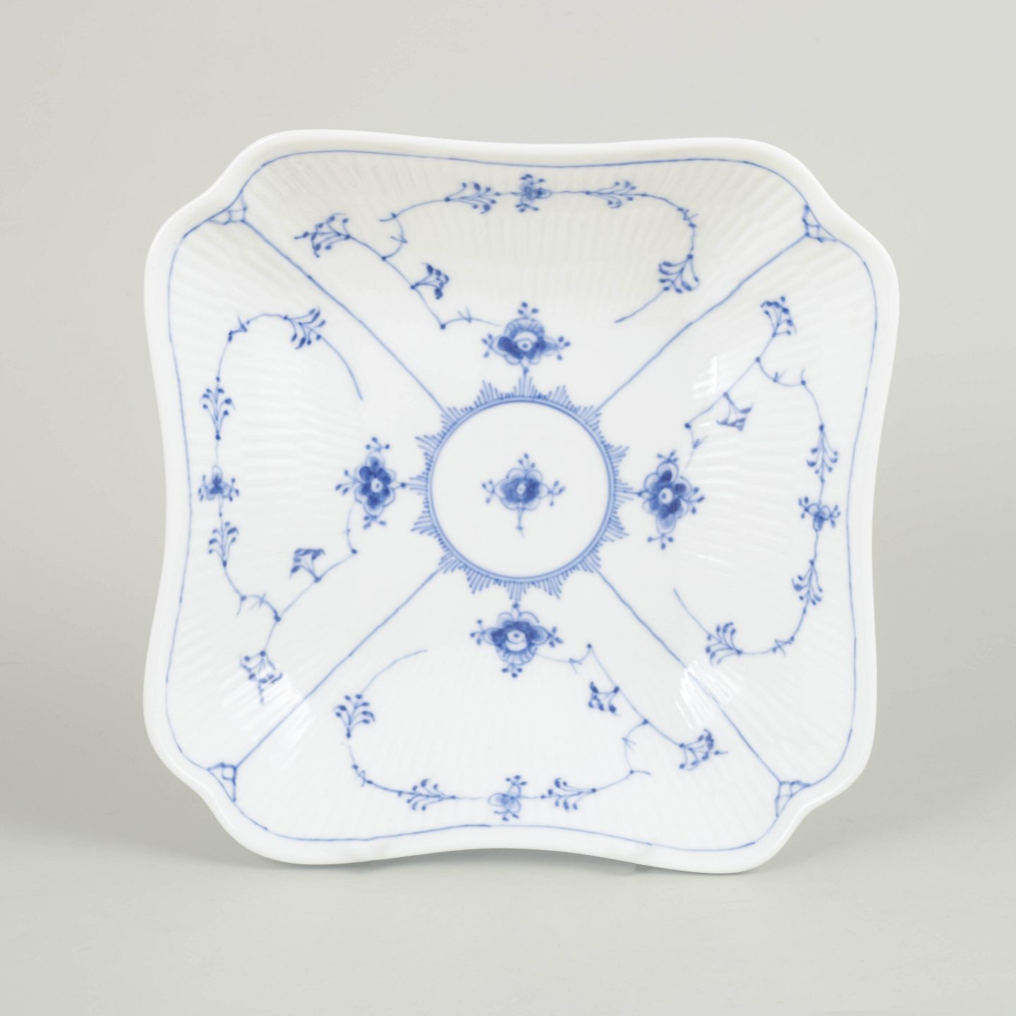 Royal Copenhagen Musselmalet Riflet, firkantet skål.Håndmalet firkantet skål i porcelæn dekoreret med det klassiske musselmalede riflet mønster i blå underglasur. Skålen har svagt buede sider med riflede detaljer og et centralt blomsterornament omgivet af slyngede blomstergrene. Undersiden er fabriksstemplet Royal Copenhagen og annulleret med én indridset streg gennem fabriksstemplet. Model 1/26.