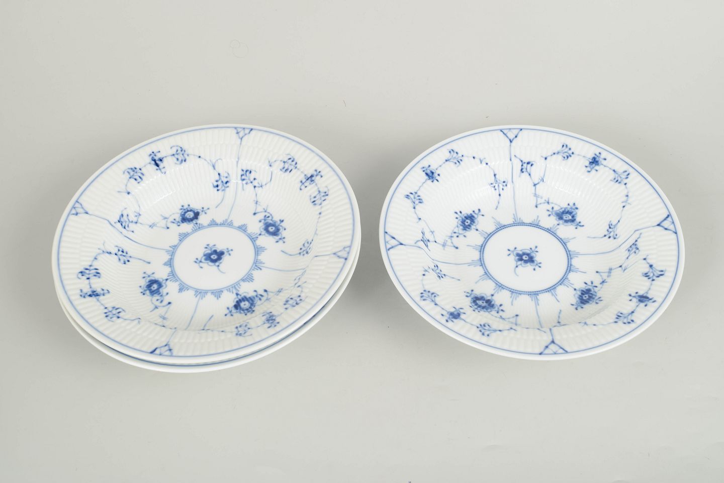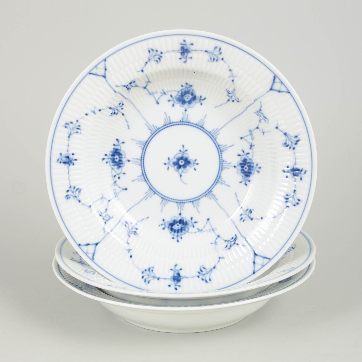 Royal Copenhagen Musselmalet Riflet, sæt af tre pasta-tallerkener.Sæt af tre håndmalede porcelænstallerkener dekoreret med det klassiske musselmalede riflet mønster i blå underglasur. Tallerkenerne har bred fane med riflede detaljer og centralt blomsterornament omgivet af slyngede blomstergrene. Undersiden er fabriksstemplet Royal Copenhagen. To tallerkener i første sortering og én annulleret med én indridset streg gennem fabriksstemplet. Model 1/168.