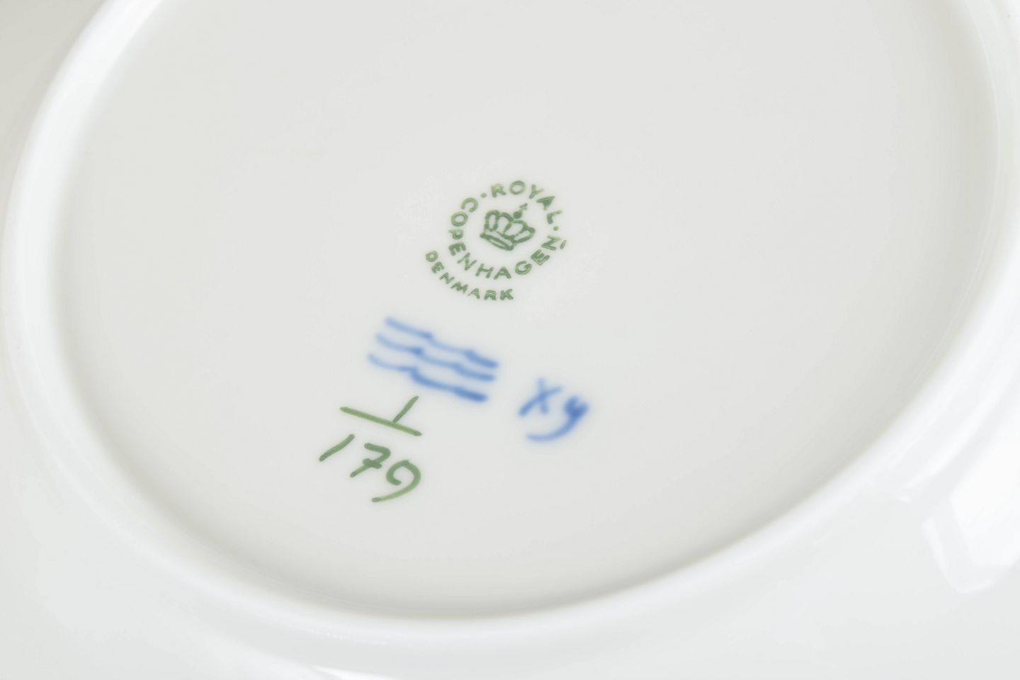 Royal Copenhagen Musselmalet Riflet, sæt af tre tallerkener.Sæt af tre håndmalede porcelænstallerkener dekoreret med det klassiske musselmalede riflet mønster i blå underglasur. Tallerkenerne har riflet fane og centralt blomsterornament omgivet af slyngede blomstergrene, et karakteristisk træk ved serien. Undersiden er fabriksstemplet Royal Copenhagen, første sortering. Model 1/179.