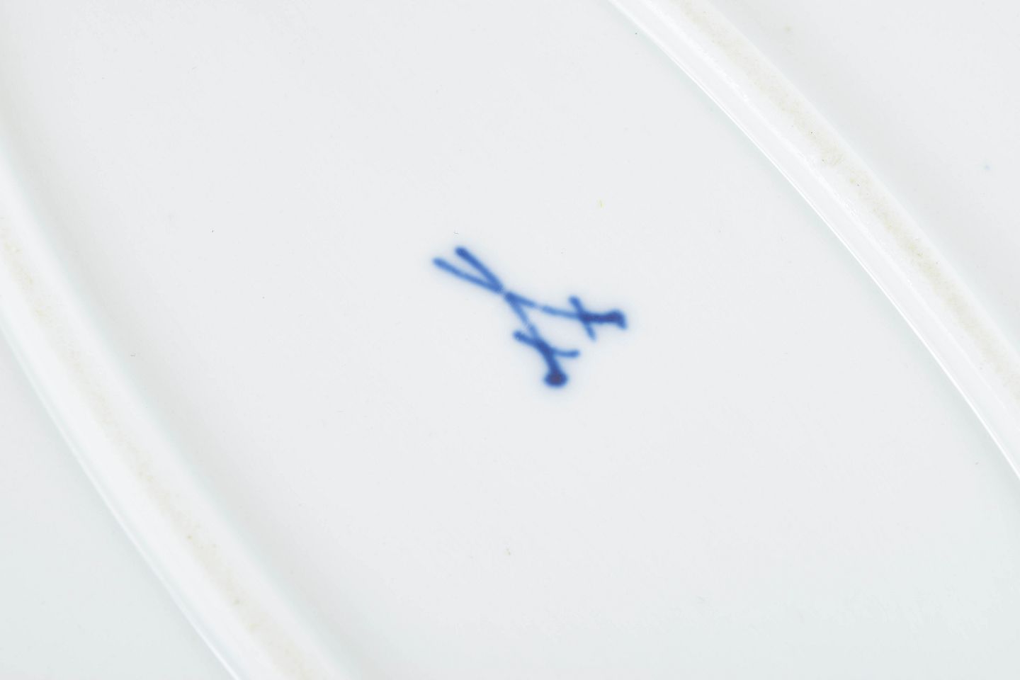 Meissen løgmønster stort ovalt serveringsfad.Stort ovalt serveringsfad i porcelæn dekoreret med det klassiske håndmalede løgmønster i koboltblå underglasur. Formen har en elegant svungen fane med kontureret rand og en central blomsteropsats omgivet af stiliserede blomster- og frugtmotiver. Modellen blev fremstillet hos Meissen i begyndelsen af 1900-tallet og er mærket på undersiden med de karakteristiske krydsede sværd, annulleret med to indridsede streger.