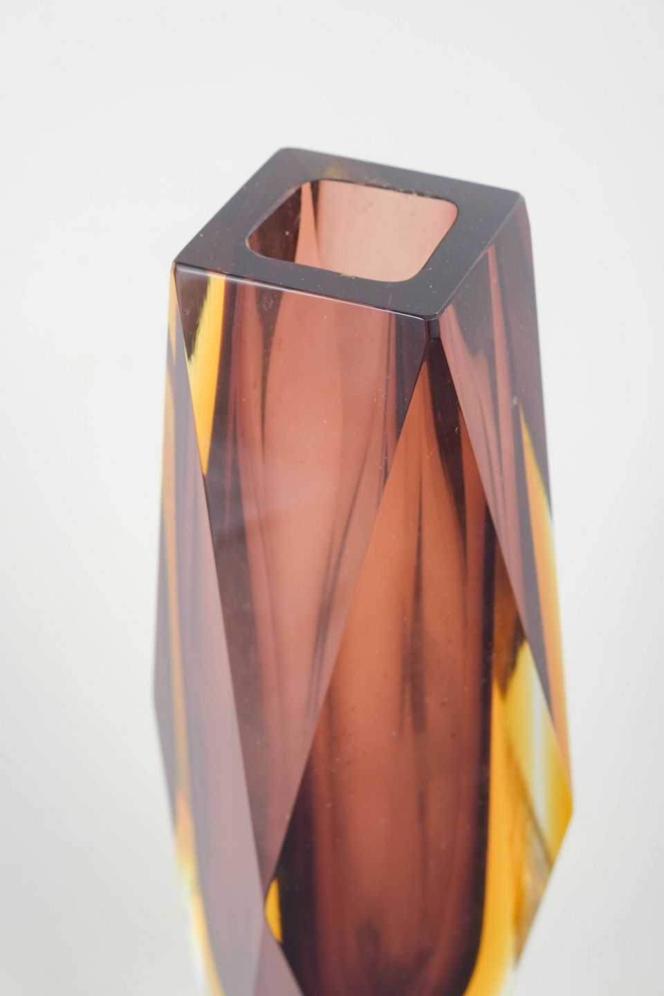 Murano, vase.Faceted art glass vase in clear glass with encased amber core and geometrically cut sides, produced in the characteristic Murano style with a strong sculptural form.