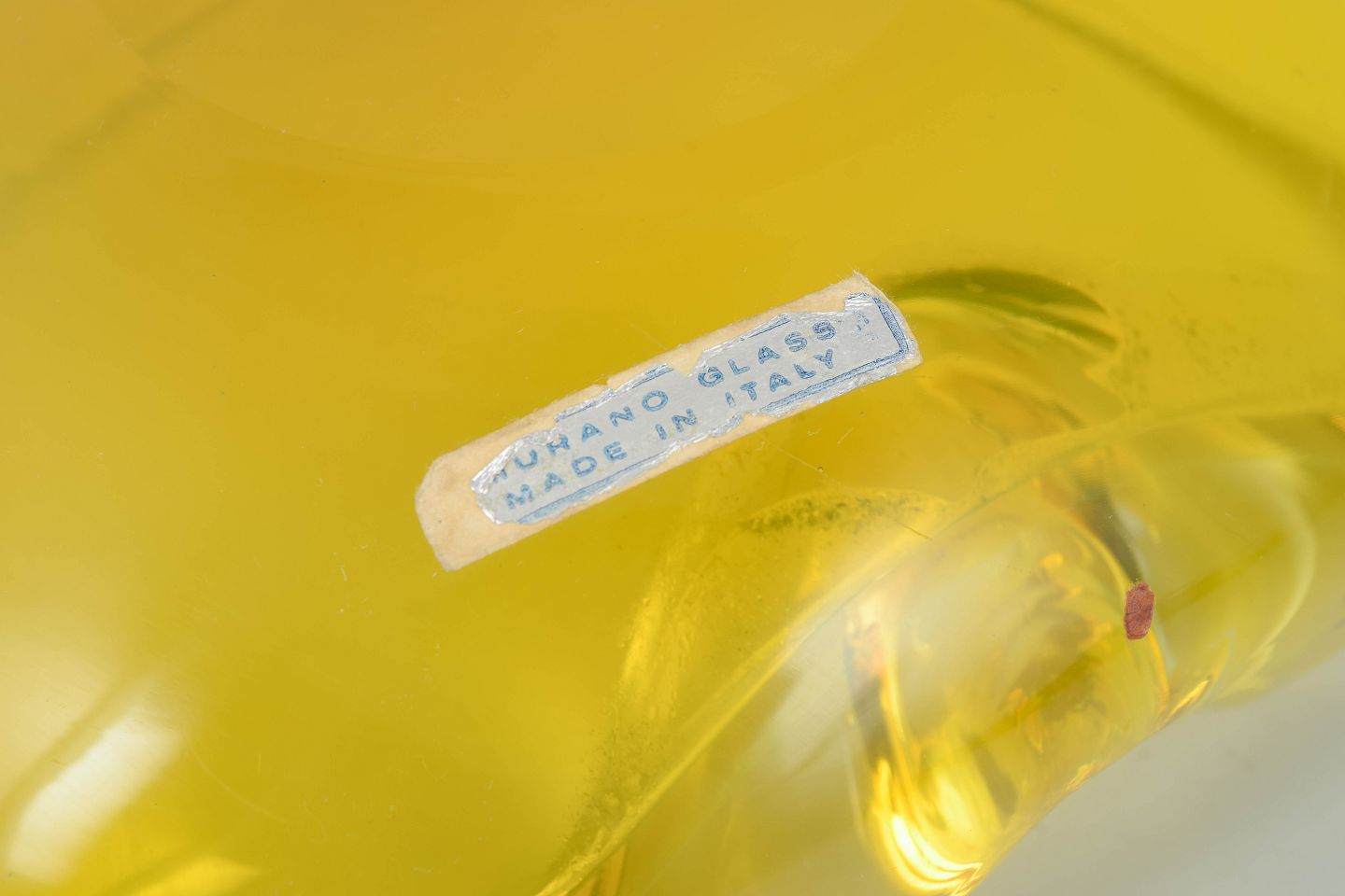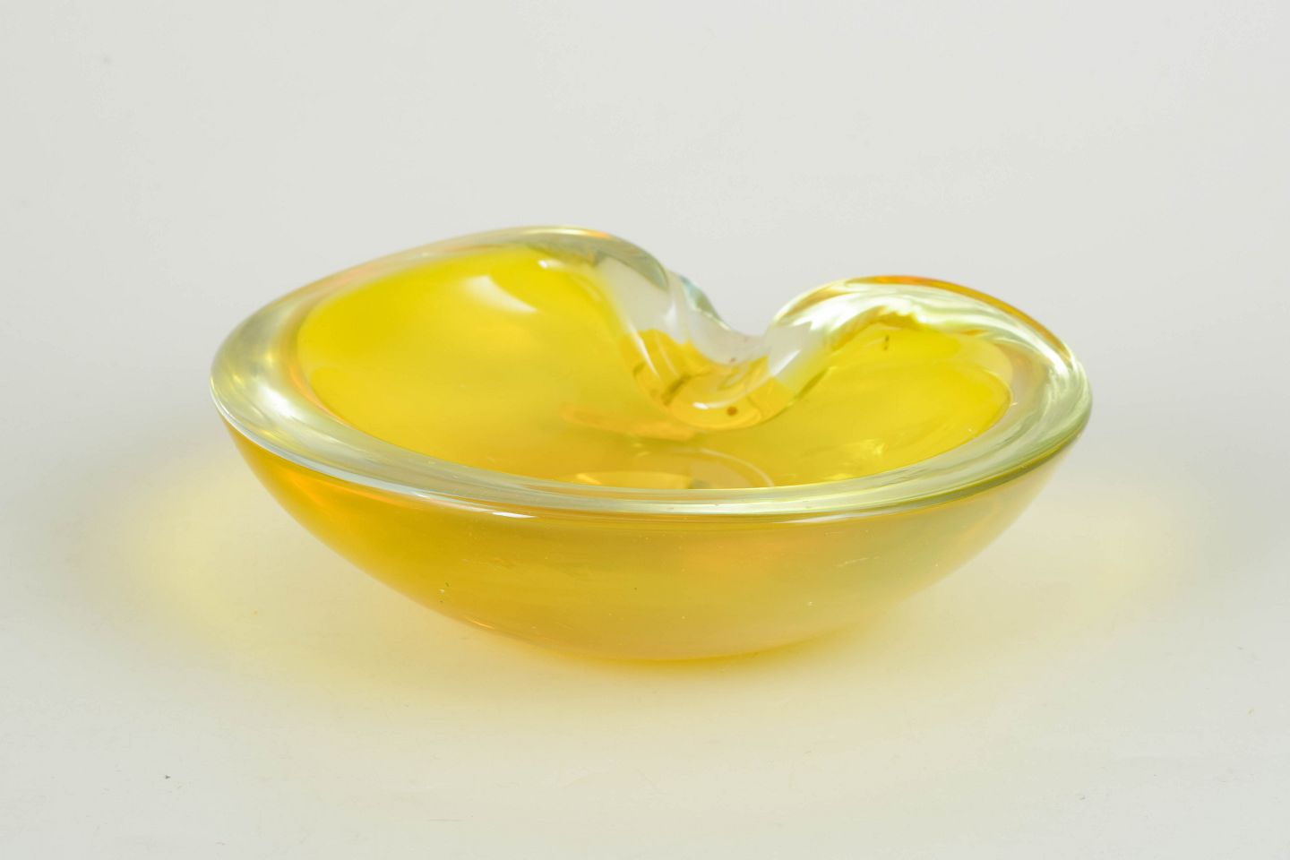 Murano, skål.Organisk formet kunstglasskål i gult glas med klar rand og blødt bølgende form. Original mærkat “Murano Glass – Made in Italy”.