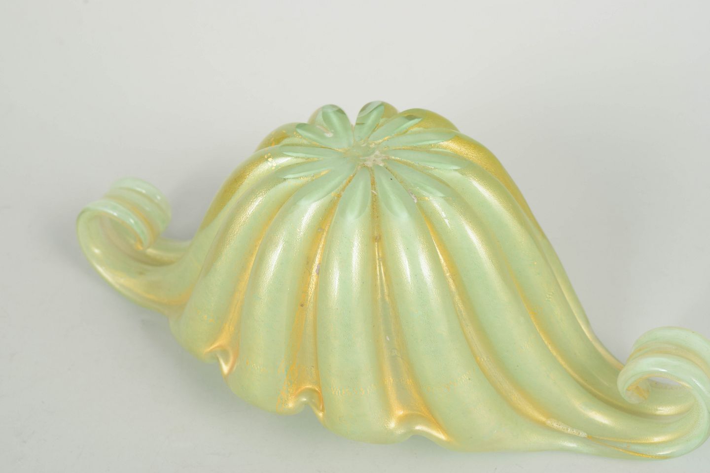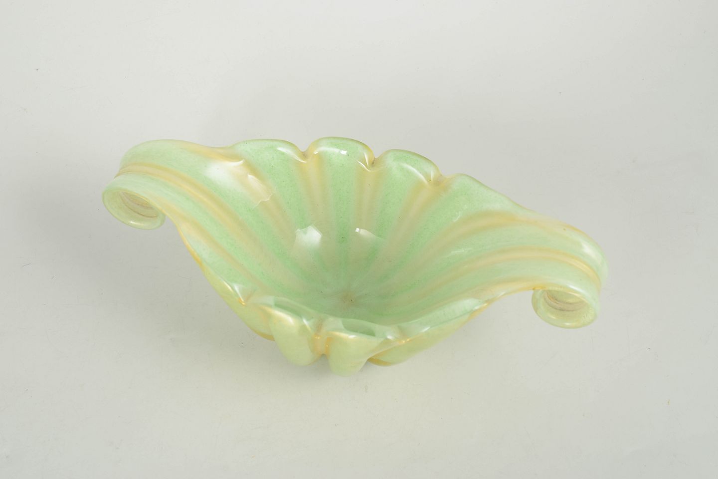 Murano, skål.Dekorativ kunstglasskål i iriserende glas med bølgende korpus og elegante opadbøjede ender, udført i karakteristisk Murano-stil med bløde former og lysreflekterende overflade.