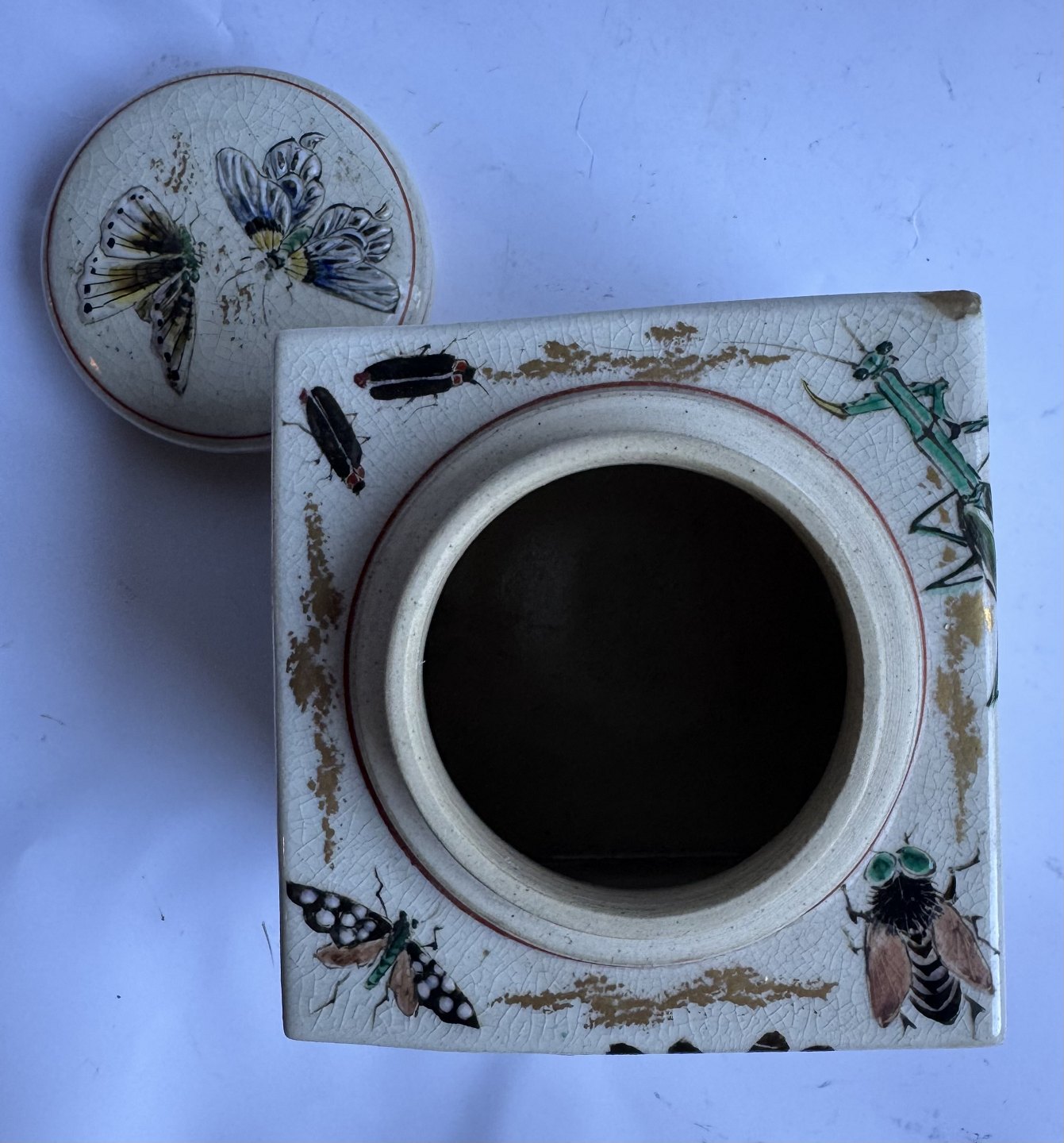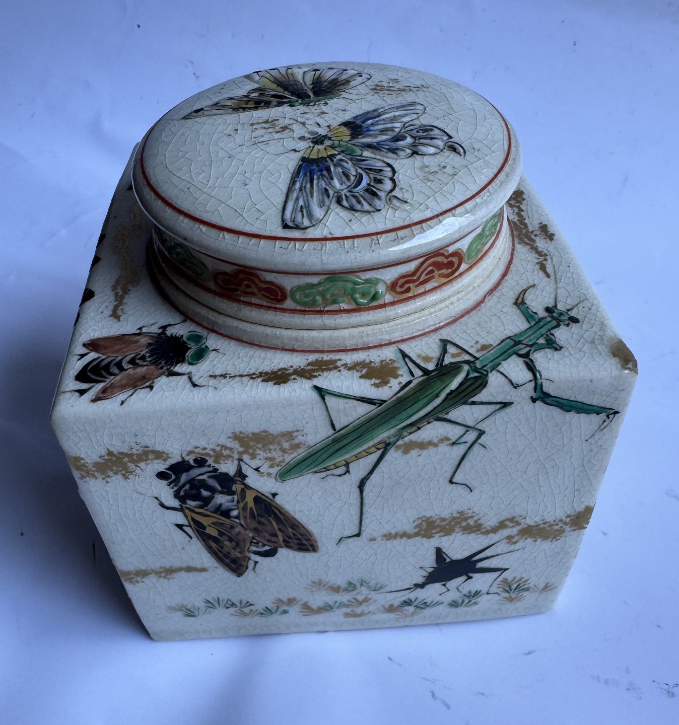 Firkantet tedåse i fajance fra Japan produceret omkring 1910. Smukt dekoreret med insekter i emalje, bl.a. sommerfugle og guldsmed, på alle sider samt på låget. Ubekendt fabriksmærke indstemplet på bunden. Ud over et lille skrab på et hjørne (følg de grå pile) er der intet at bemærke. Mål: H. 10,7 cm samt 9,5 x 9,5 cm.v/ Jesper Reutemann