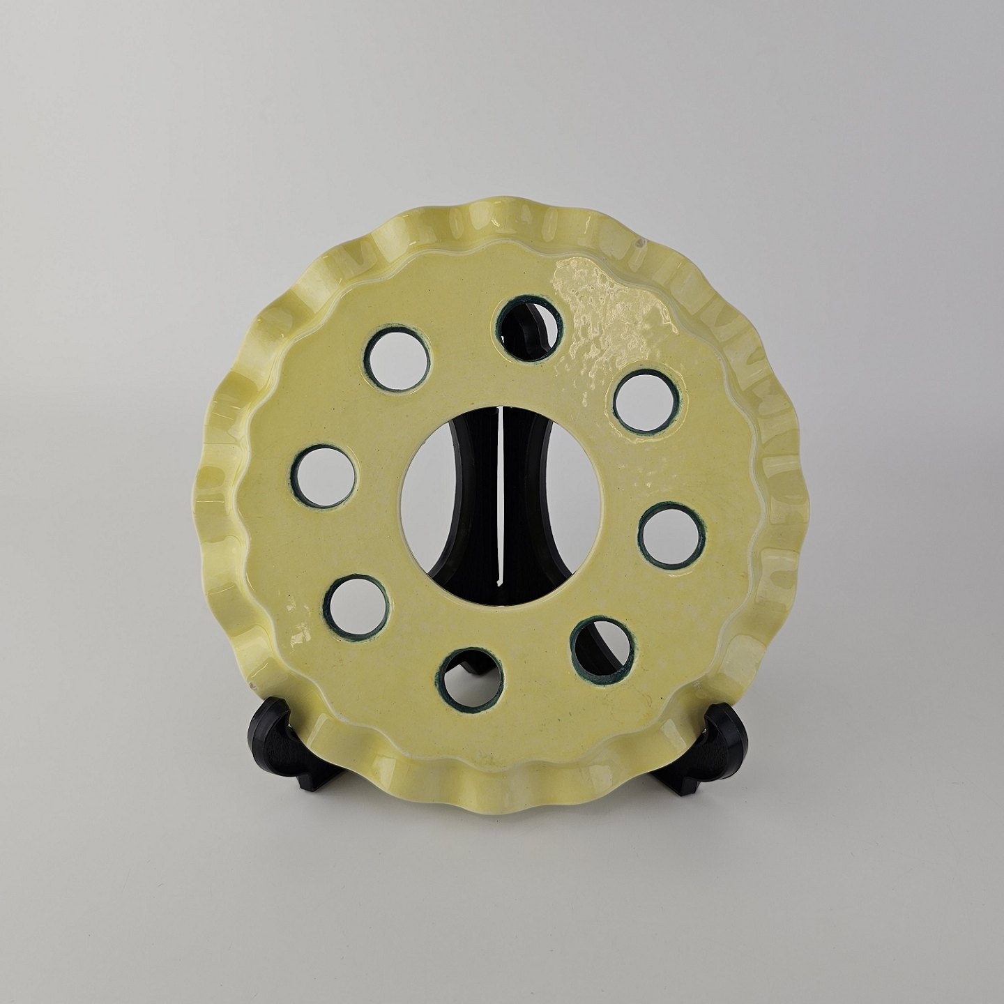 Fajancestel i stelform C med dekoration i gule nuancer med grøn stribe.