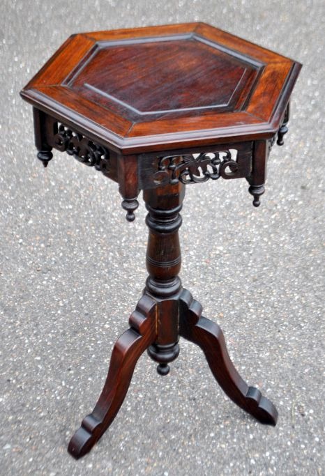 Sekskantet sidebord, 19. årh. Kina. Mahogni. På tre ben med udskæringer. H: 58,5 cm. B: 39 cm.Emne nummer: 29077