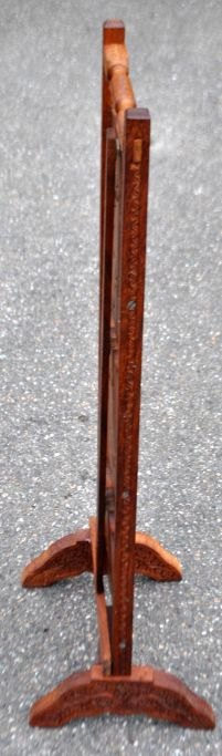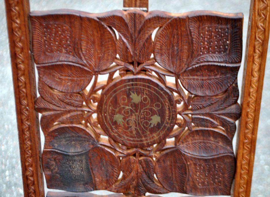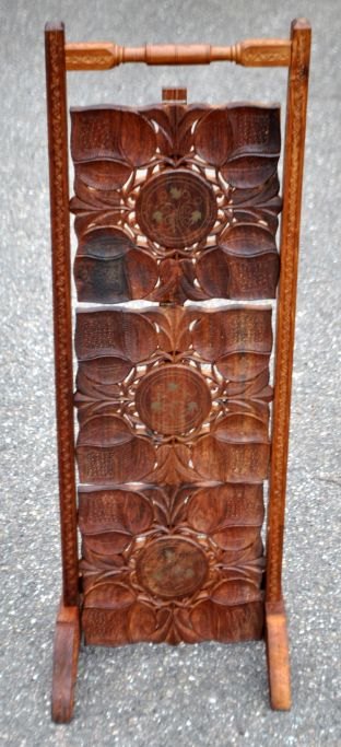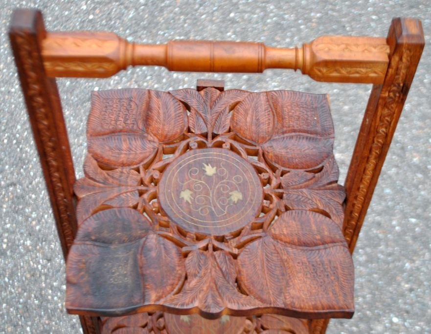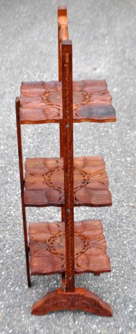 Cake stand i teak træ, 19. årh. Indien. Med tre etager med udskæringer af blomster og blade. Med messing intarsia i form af blomster. H: 80,5 cm. B: 27,5 cm. D: 24 cm.Emne nummer: 29079
