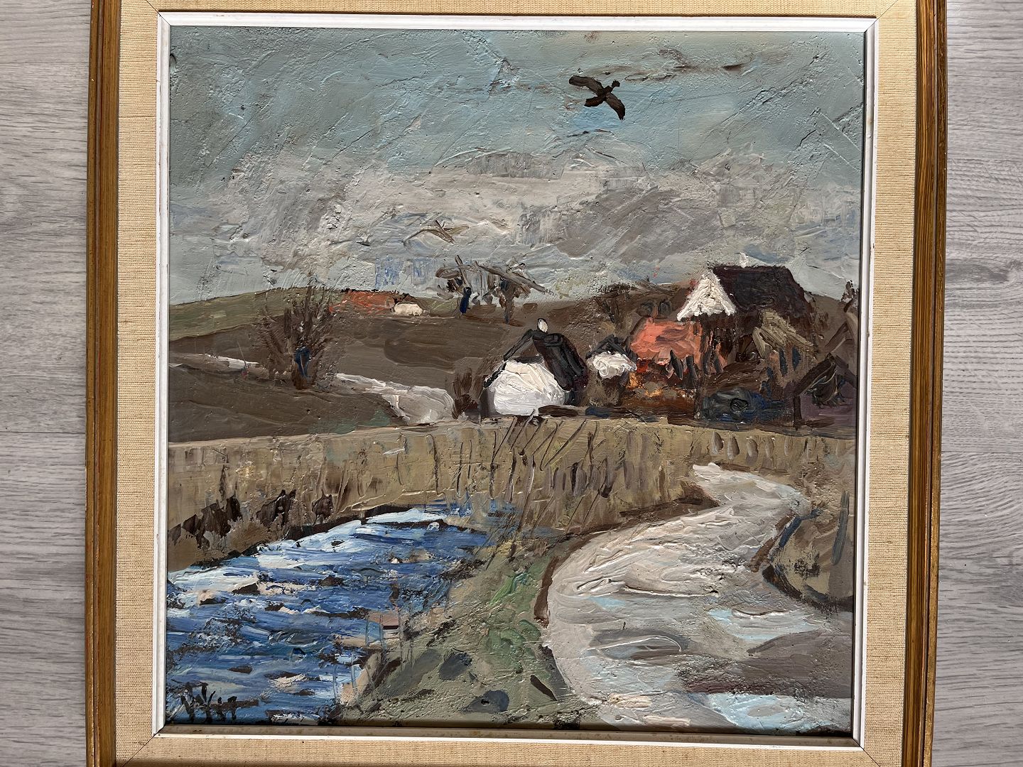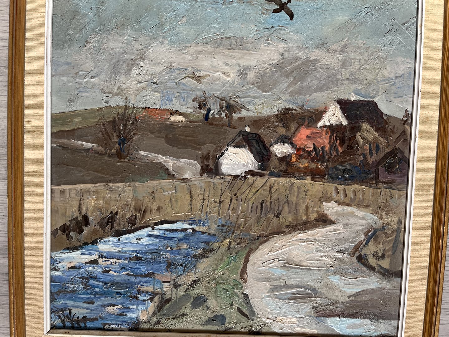 William Hansen (1908-91):Landskab med å og flyvende fugle 1977.