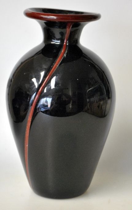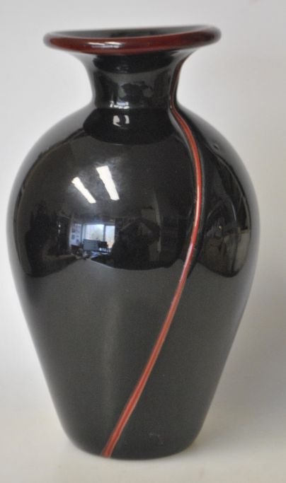 Vase in black glass, 20th century. Black with reddish-brown stripes. H: 19.5 cm. Without stamp.Item number: 29078