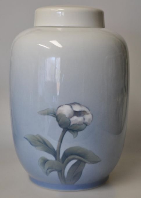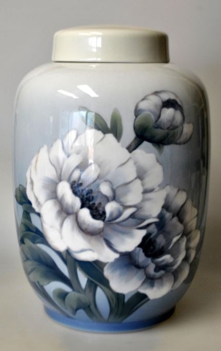 Lågkrukke i porcelæn, Royal Copenhagen no. 92/888, 20. årh. København, Danmark. Dekoreret med pæoner. Stemplet. H: 25 cm. Dia: 17 cm.1. Sortering.