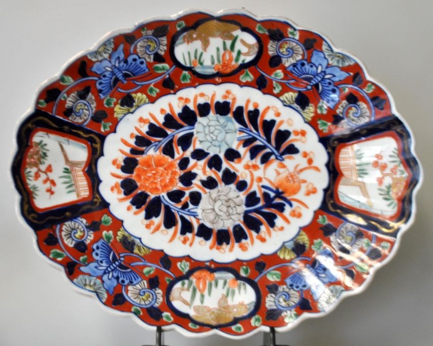 Ovalt Imari fad i porcelæn, 19. årh. Japan. Med bølget rand. Polykrom dekoration med blomster og fisk. Delvis i transfer teknik. H: 25 cm. L: 31 cm.Emne nummer: 29096