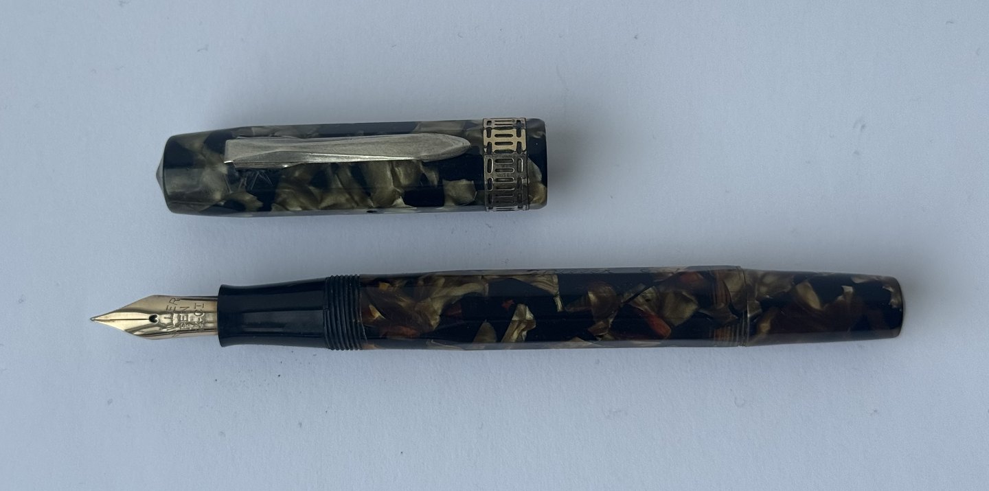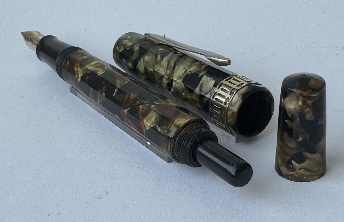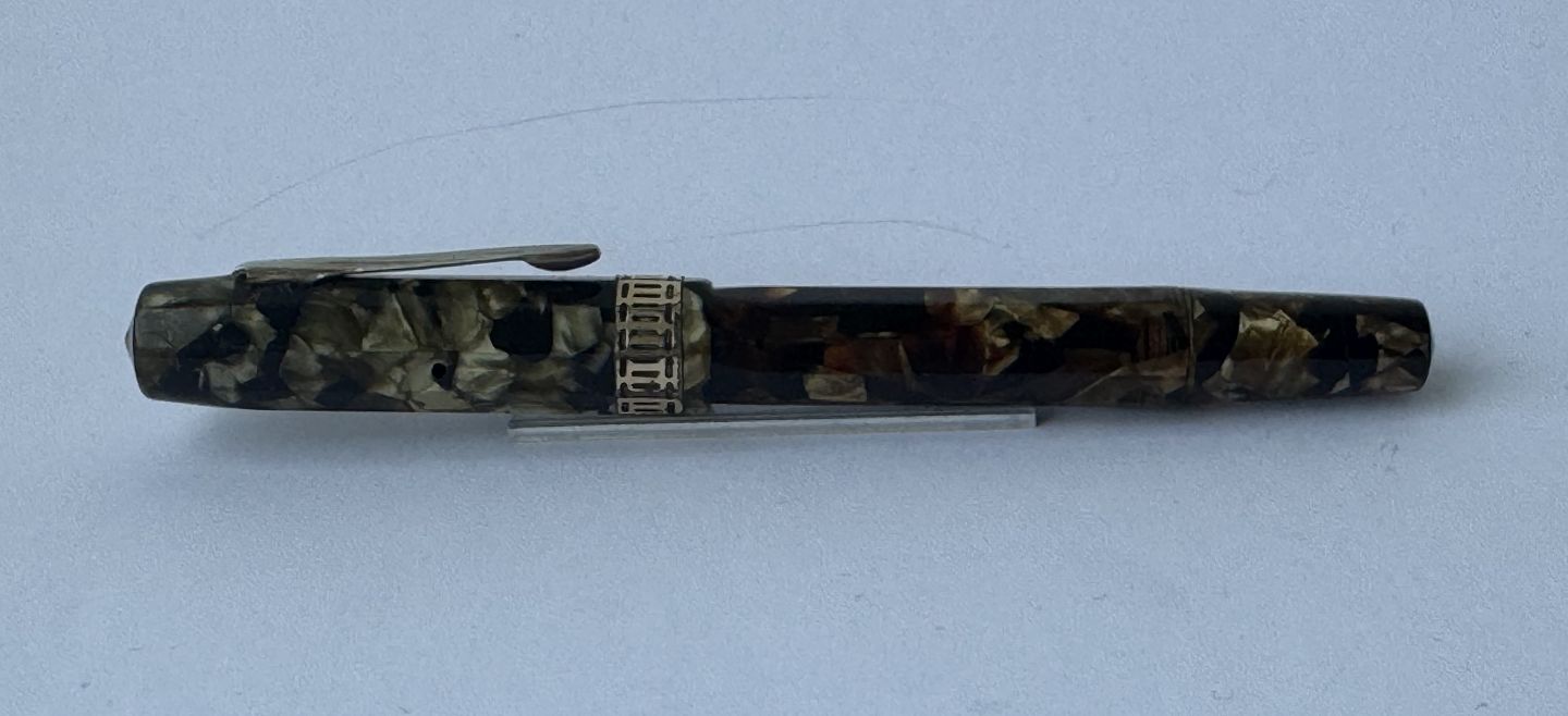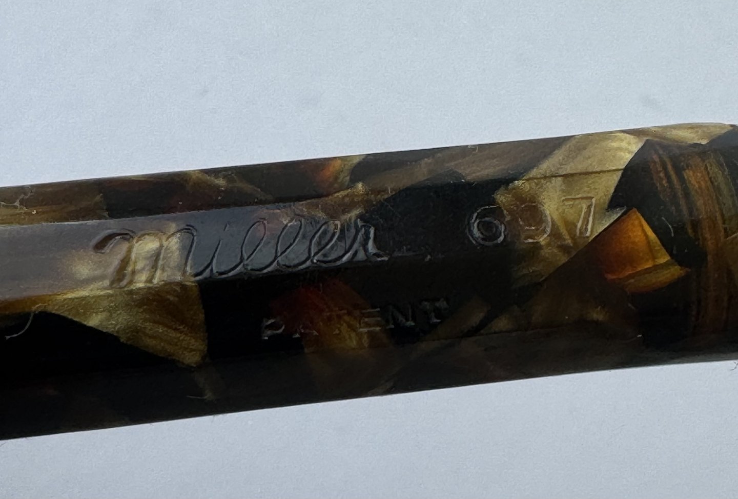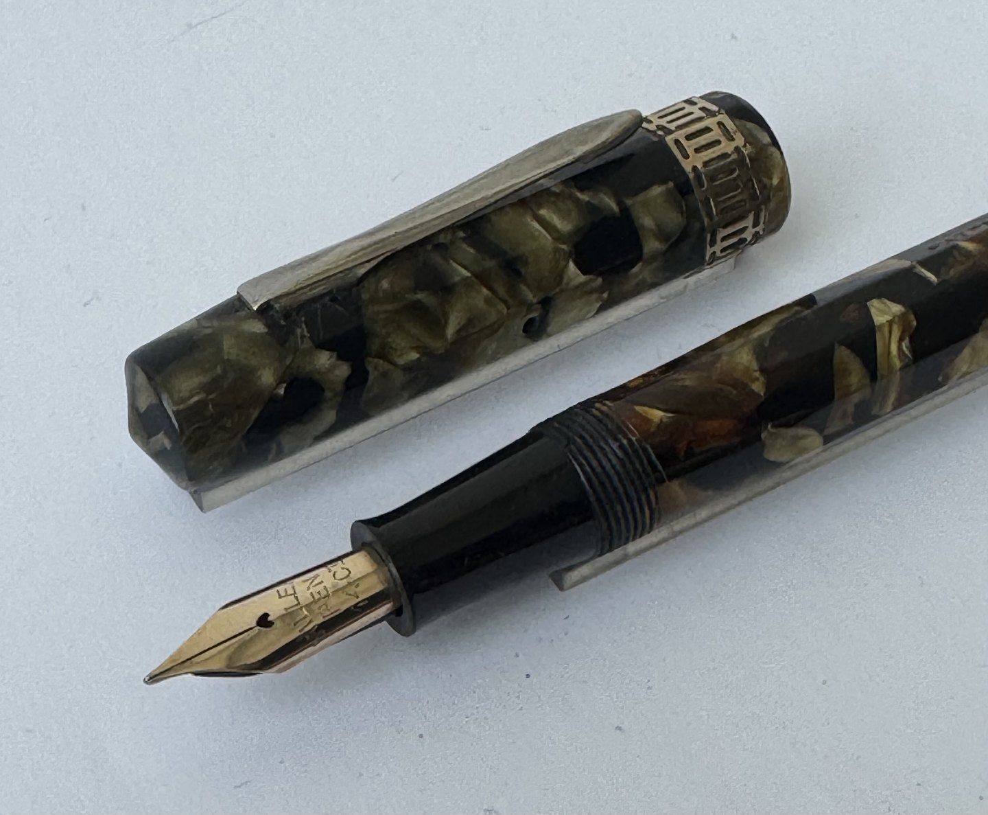 REN ART DECO STIL: 10 kantet og grøn marmoreret Miller nr. 697 fyldepen fra omkring 1940. I god stand uden skader eller reparationer. Alle dele originale til denne model inklusive en 14 karats guldspids (ca. 0,30 gram). Ny gummisæk skal indsættes før den igen kan optage blæk og skrive påny. Ny gummisæk kan indsættes for et tillæg på kr. 250,00. Fyldepennen er 12,3 cm lang.v/ Jesper Reutemann