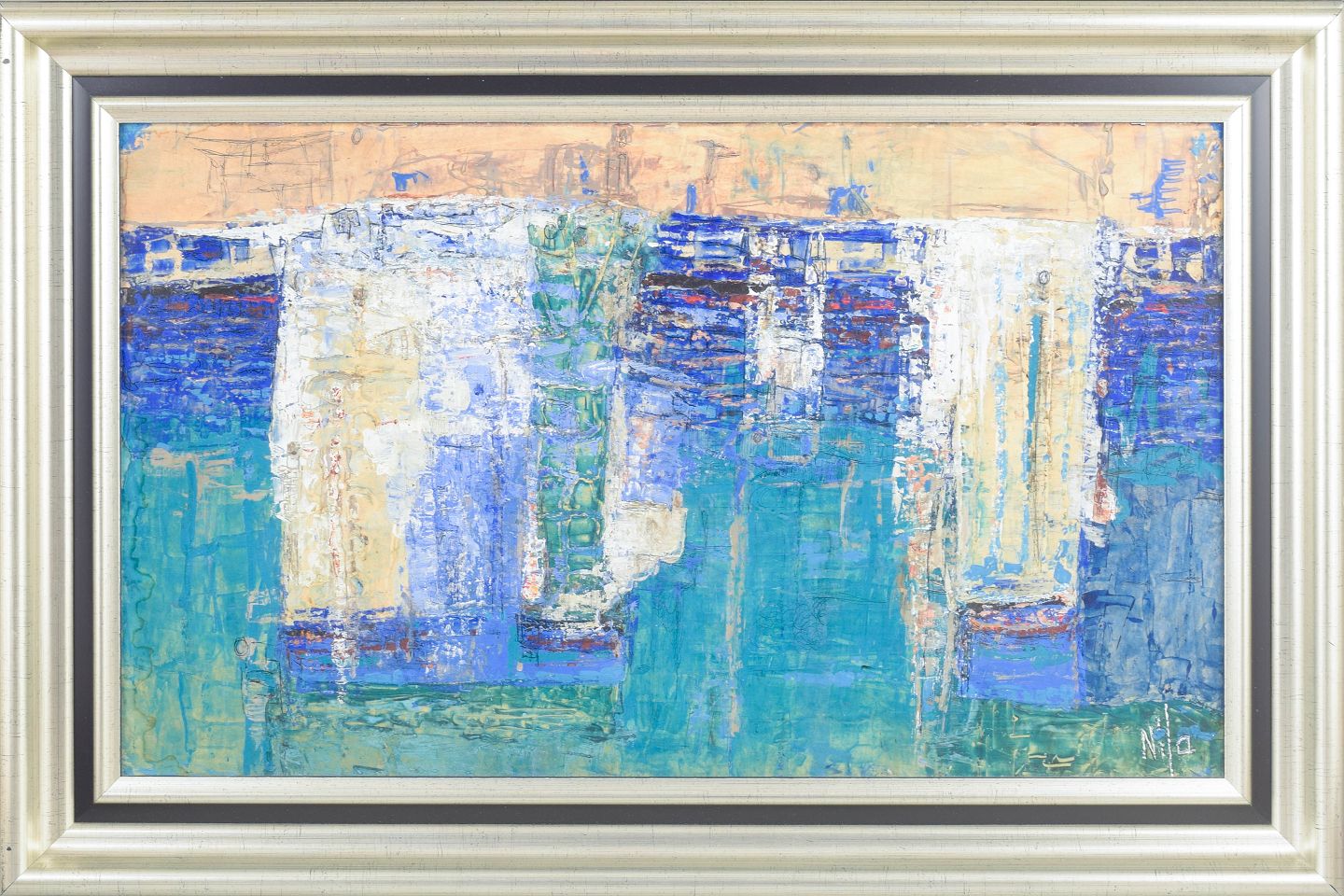 Lauri Nila, abstract composition, listed Finnish artist.Abstract composition executed in oil on board with textured brushwork and a nuanced palette dominated by blue and turquoise tones. Signed.