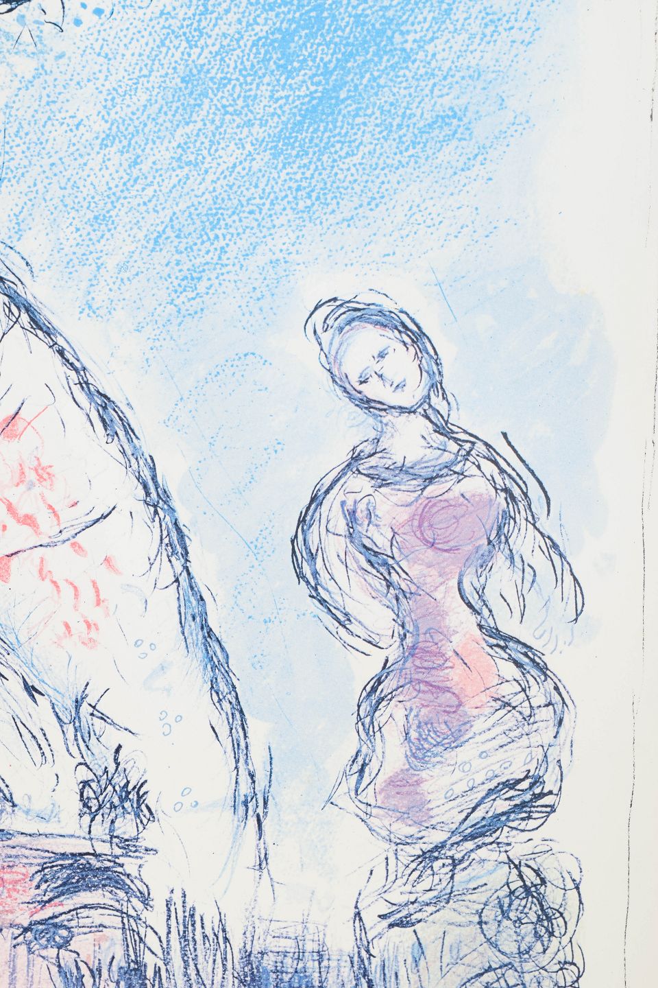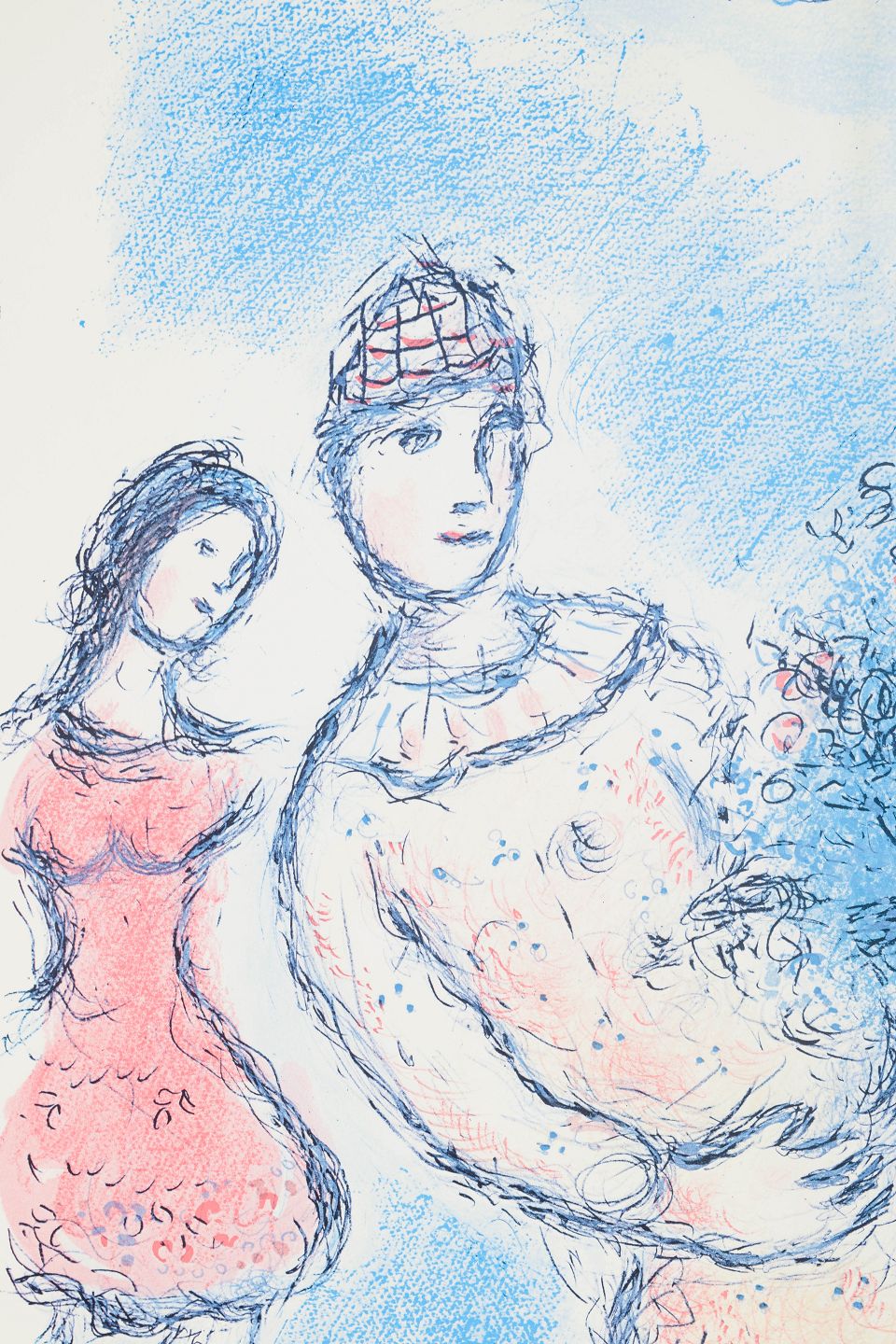 Marc Chagall (1887–1985) var en russisk-fransk kunstner og en af det 20. århundredes mest betydningsfulde modernister. Han arbejdede med maleri, grafik, scenografi og glasmaleri og er kendt for sine poetiske, drømmeagtige kompositioner med svævende figurer, kærlighedspar, dyr og bymotiver. Chagall udviklede et personligt billedsprog, der kombinerede elementer fra kubisme, fauvisme og symbolisme. Hans litografier og grafiske arbejder, ofte produceret i samarbejde med trykkerier som Mourlot i Paris, er blandt de mest efterspurgte grafiske værker fra det 20. århundrede.