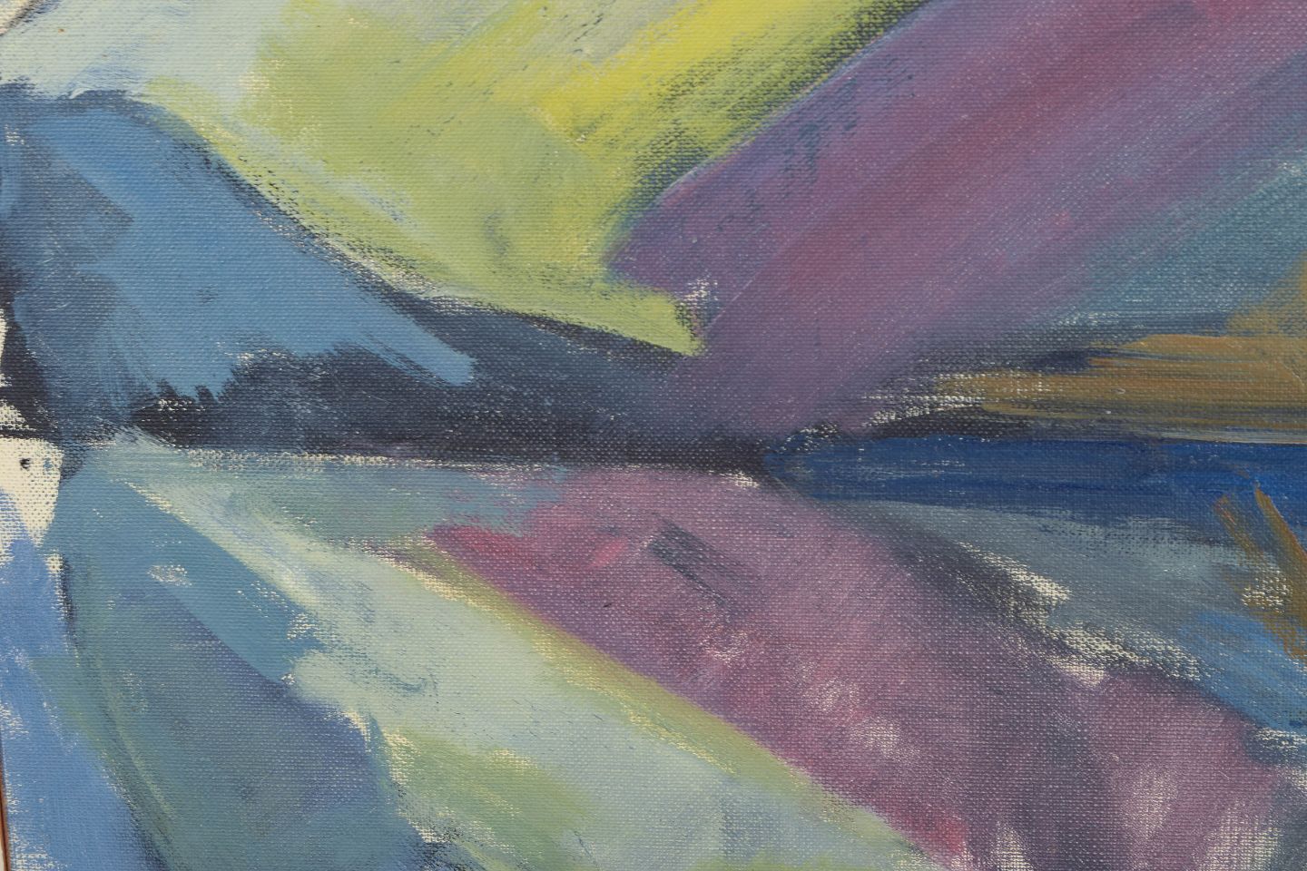 Stig Delang, oil painting on canvas, listed Swedish artist.Modernist northern landscape with stylised forms and reflections across a water surface, executed with broad brushwork and muted tones of blue, green and violet. Signed.