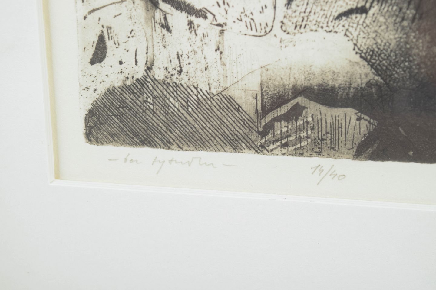 Skandinavisk kunstner, litografi.Ekspressivt figurativt motiv udført som litografi med to figurer i tæt komposition, udført i sort og gråtoner med markante grafiske skraveringer. Signeret i blyant nederst, signaturen er vanskelig at tyde, og nummereret 14/40.