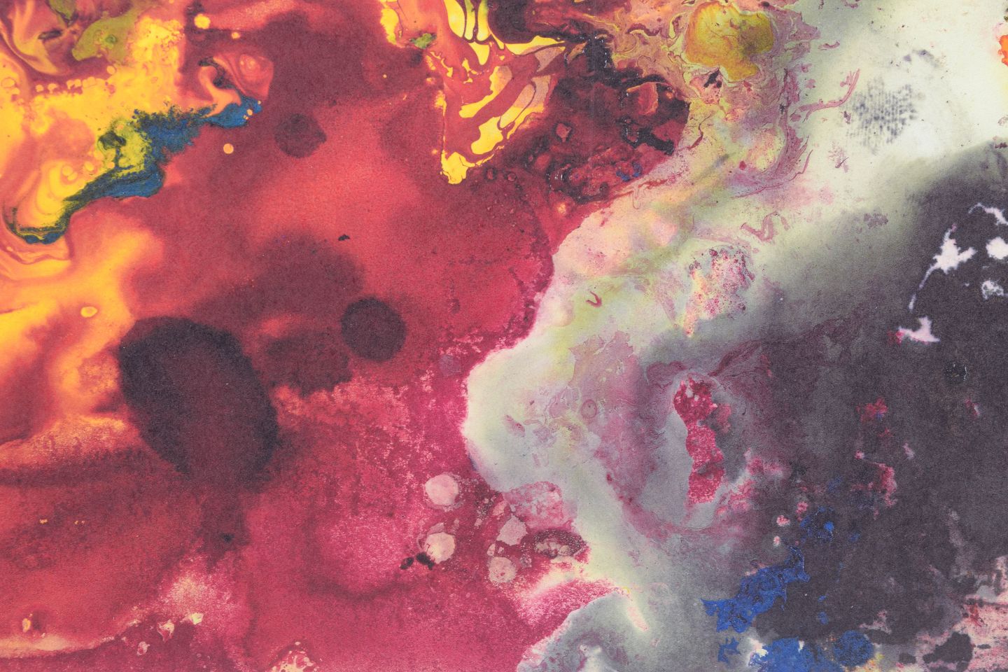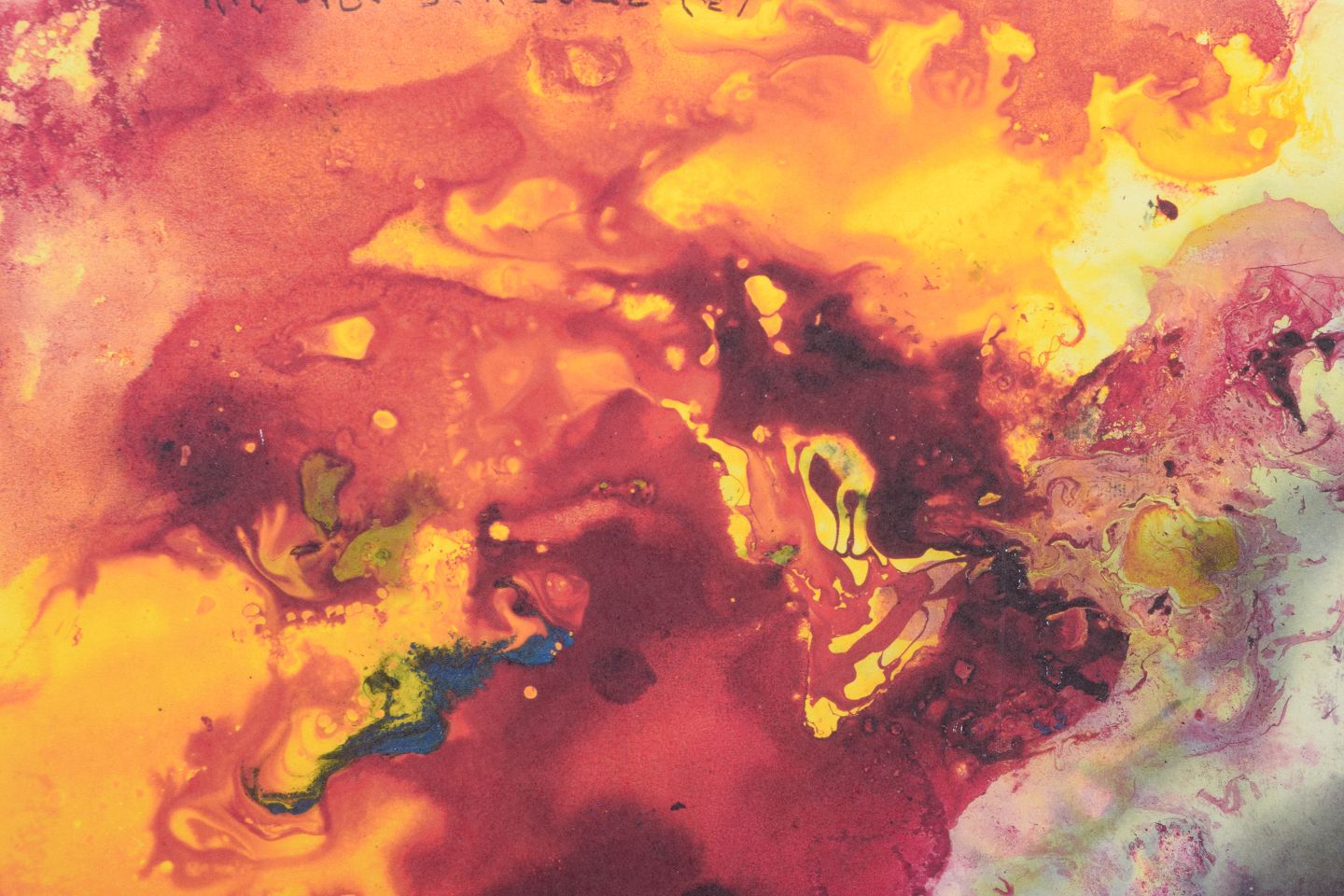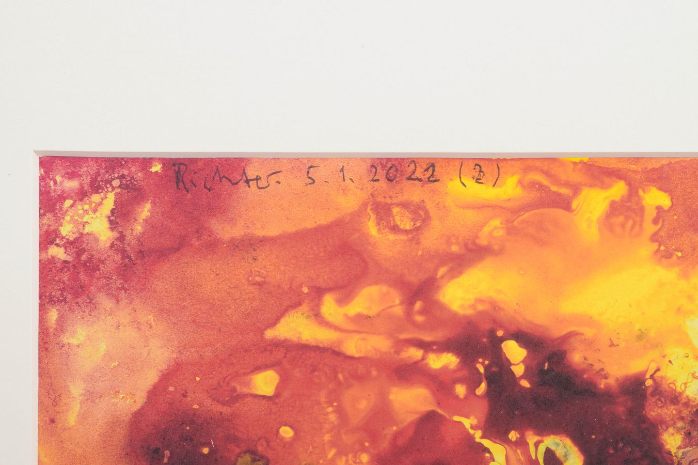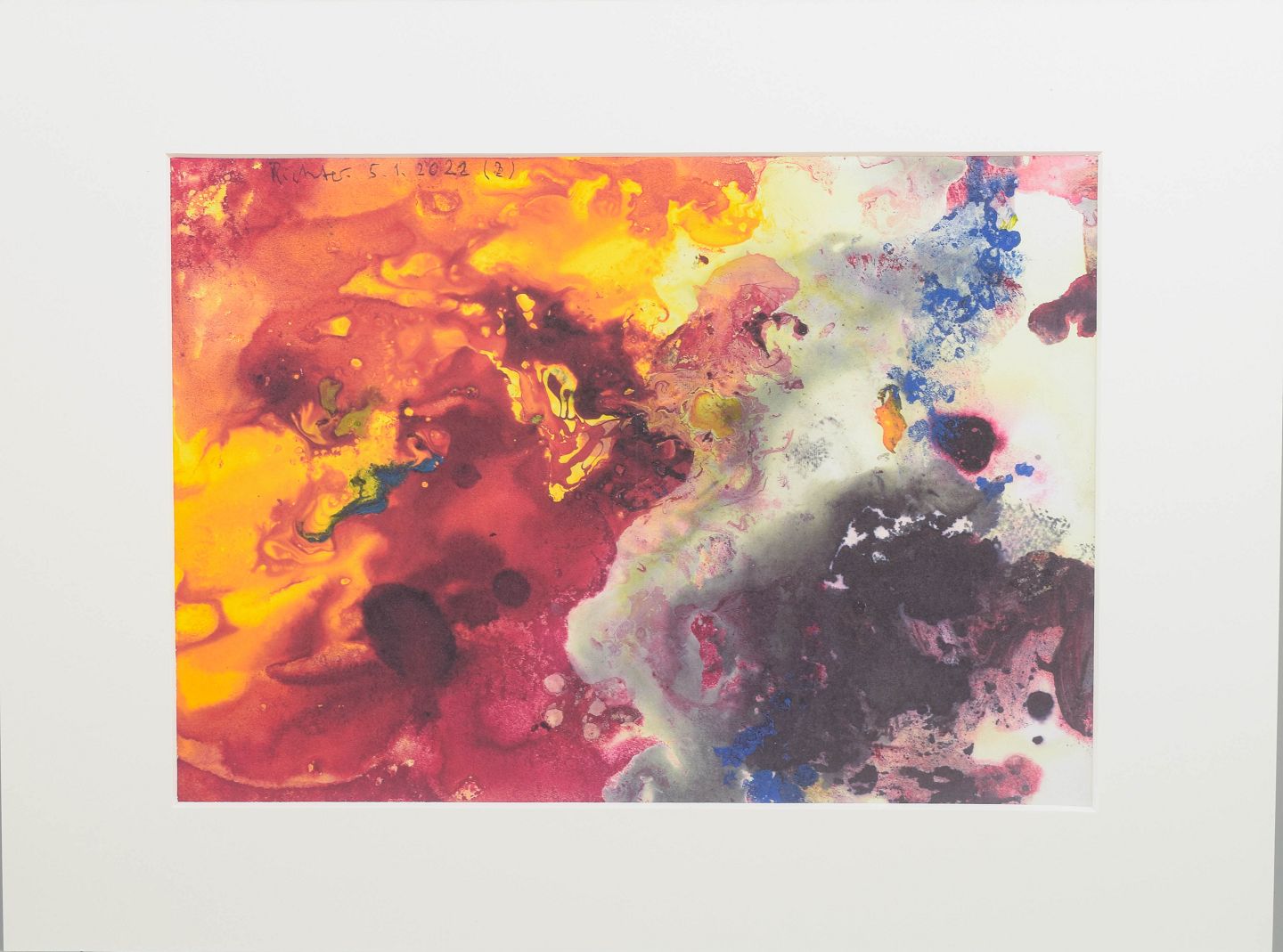 Gerhard Richter, farvetryk, tysk kunstner.Abstrakt komposition udført som farvetryk med dynamiske farvefelter i intense røde, gule, blå og mørke toner. Motivet har en flydende og eksplosiv karakter med organiske former og transparente lag. Signeret i blyant, dateret 2022.