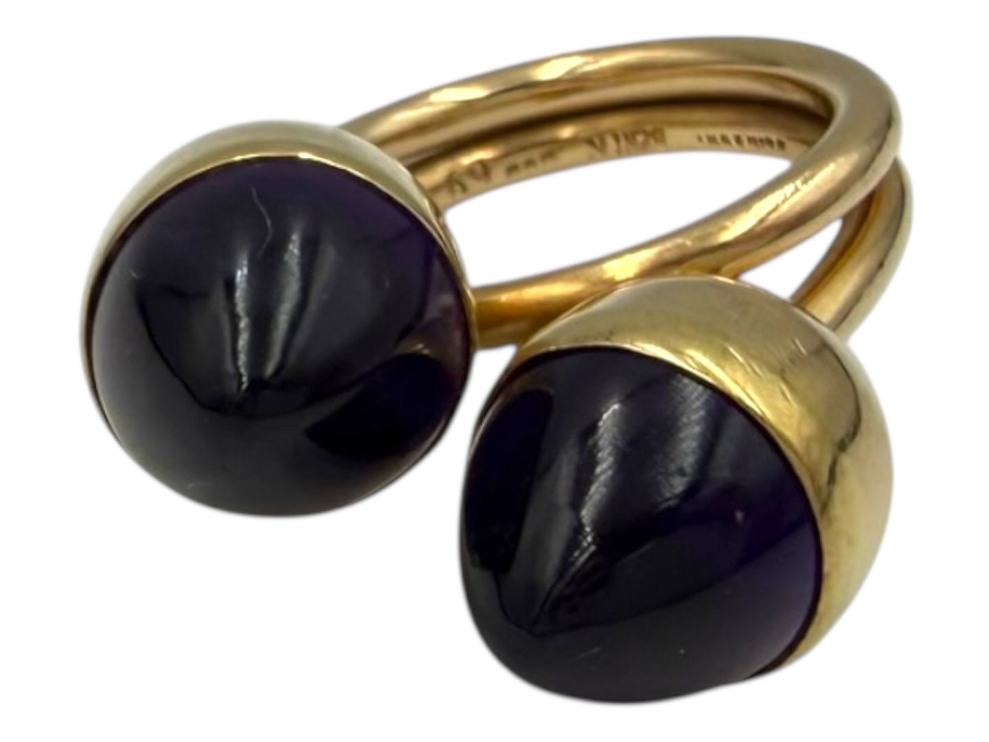 Bent Knudsen, stor 14 karat guldring med to runde lilla ametyster fra 1970'erne. Lækker kraftig kvalitet.Designnummer 69.