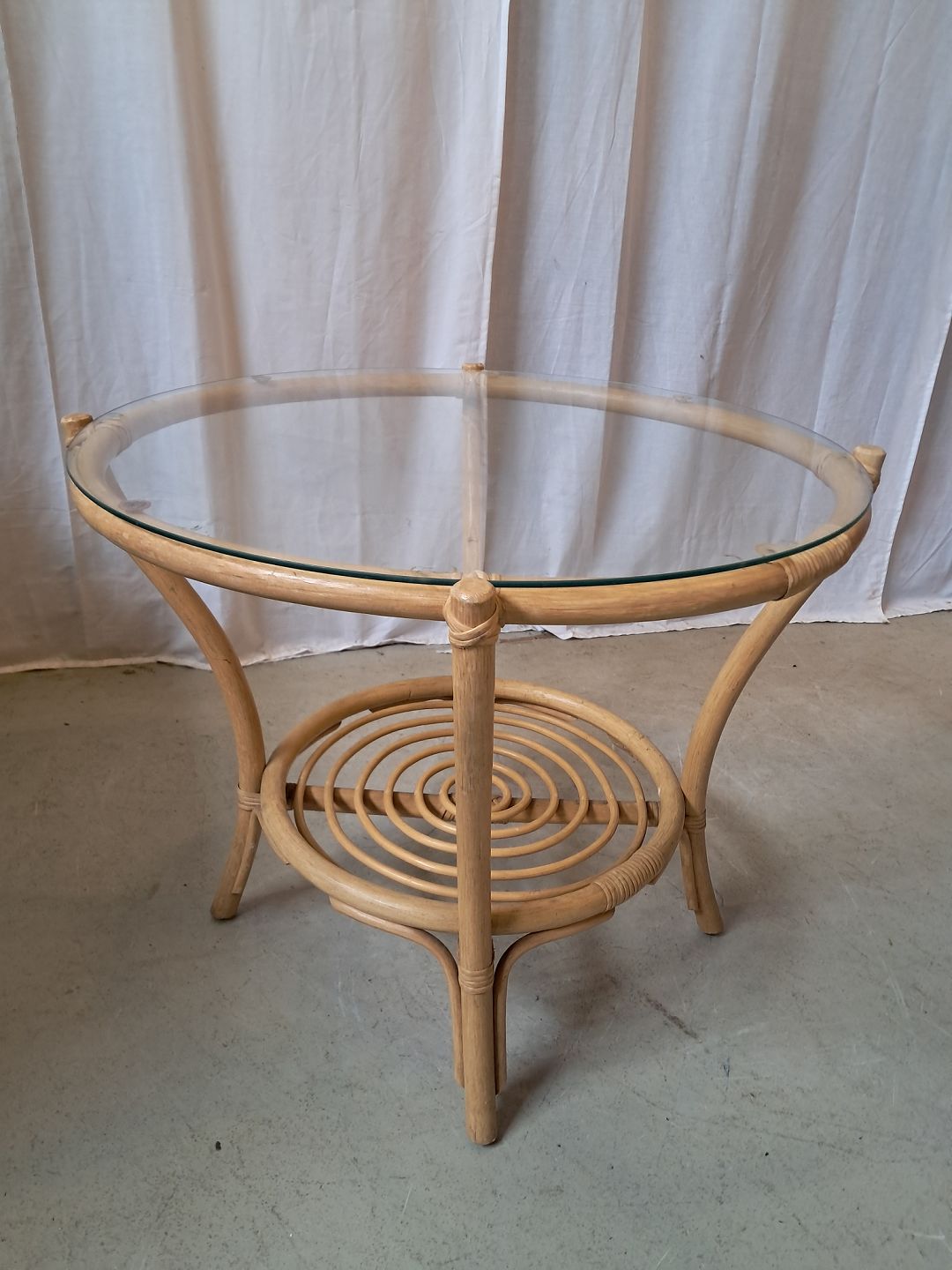 Bord i bambus med glasplade, fra 1990erne.Det har brugsspor.