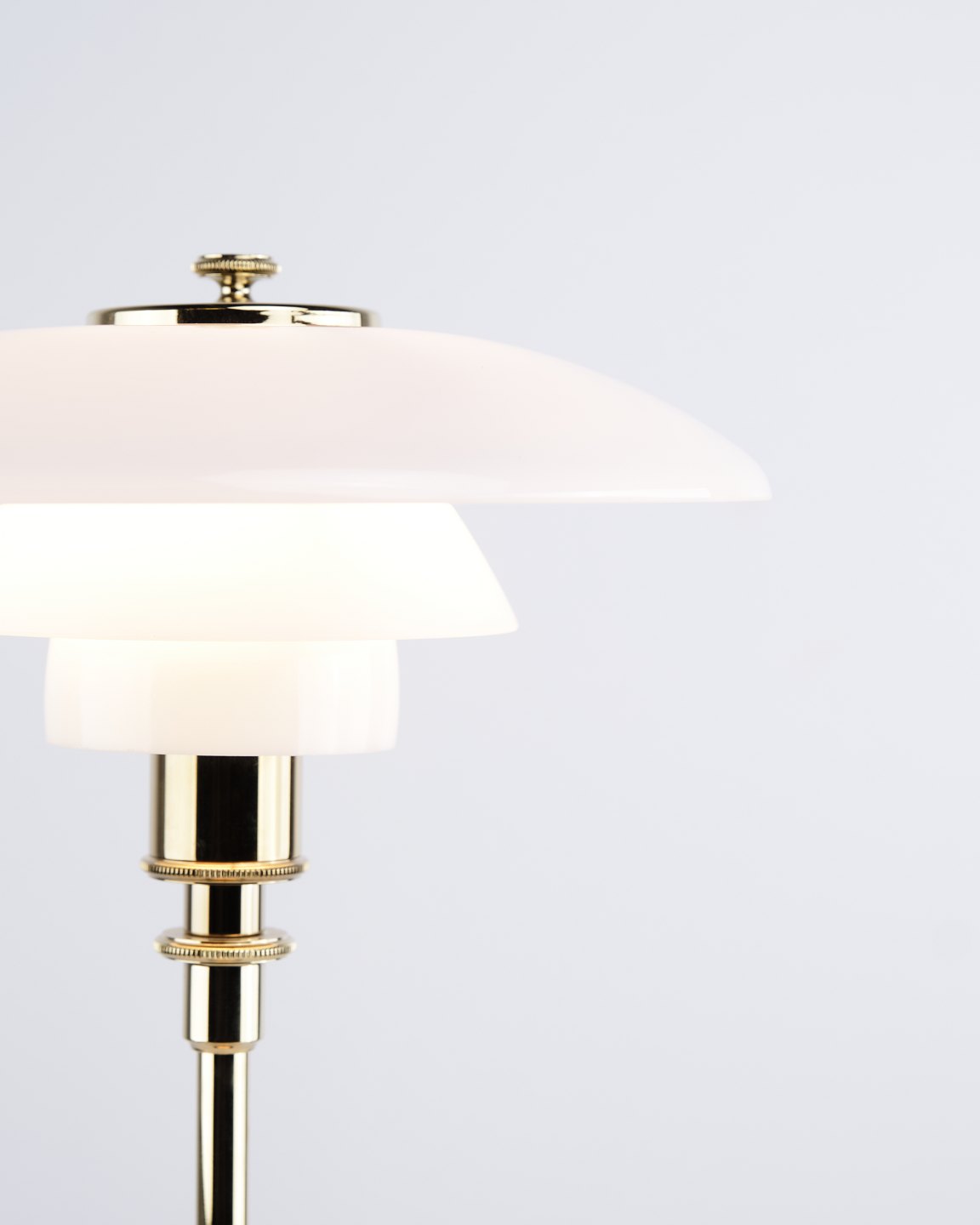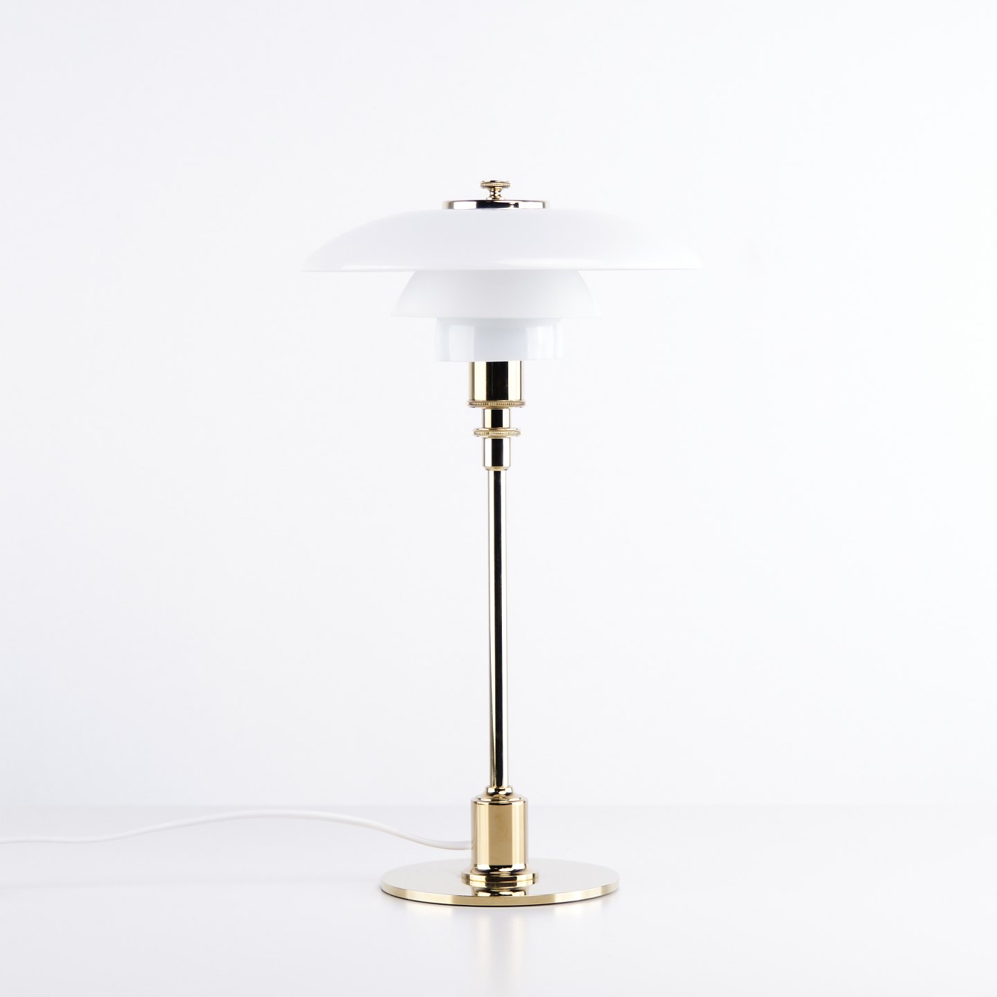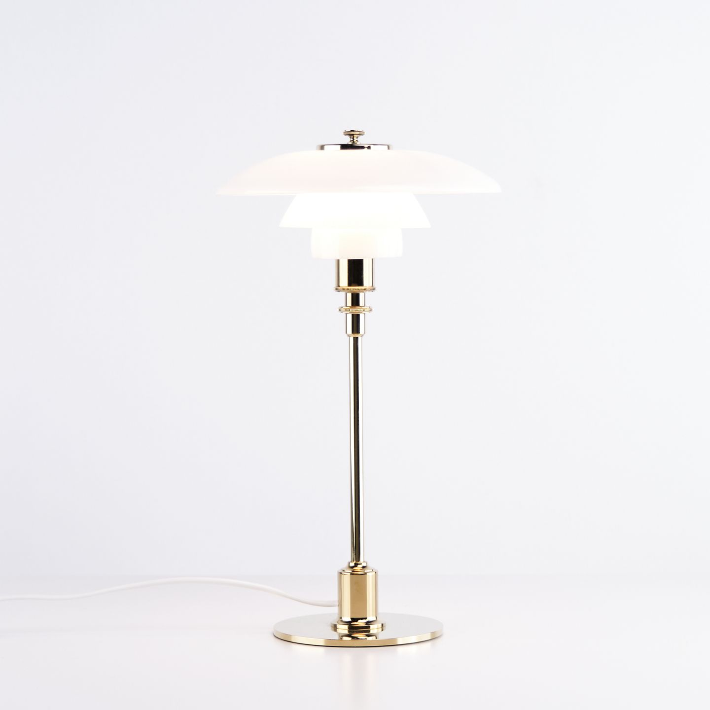 PH 2/1 bordlampe designet af Poul Henningsen og introduceret i denne version af Louis Poulsen i 2019. Lampen er udført med fod i messing og skærme i hvidt opalglas, som giver et blødt og behageligt lys. Det ikoniske treskærmssystem er udviklet til at sikre optimal lysfordeling og minimere blænding.— Oprindelse: Danmark