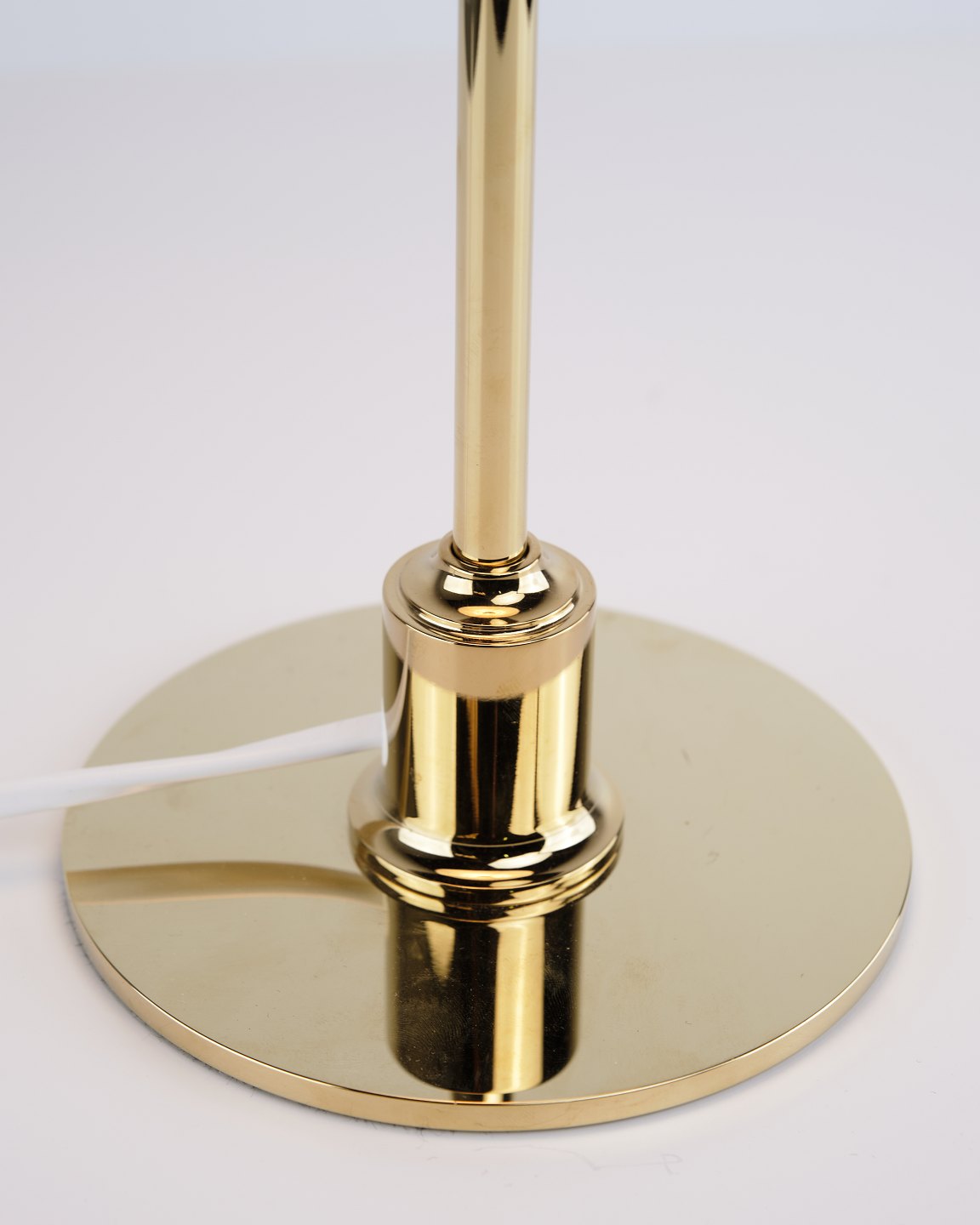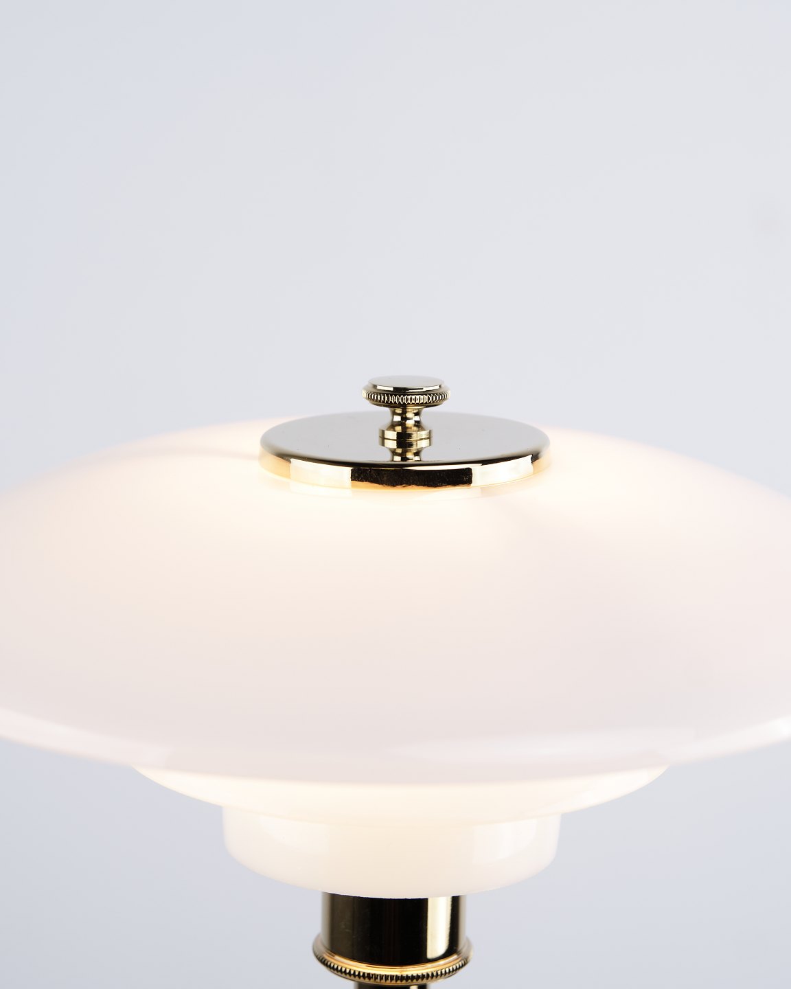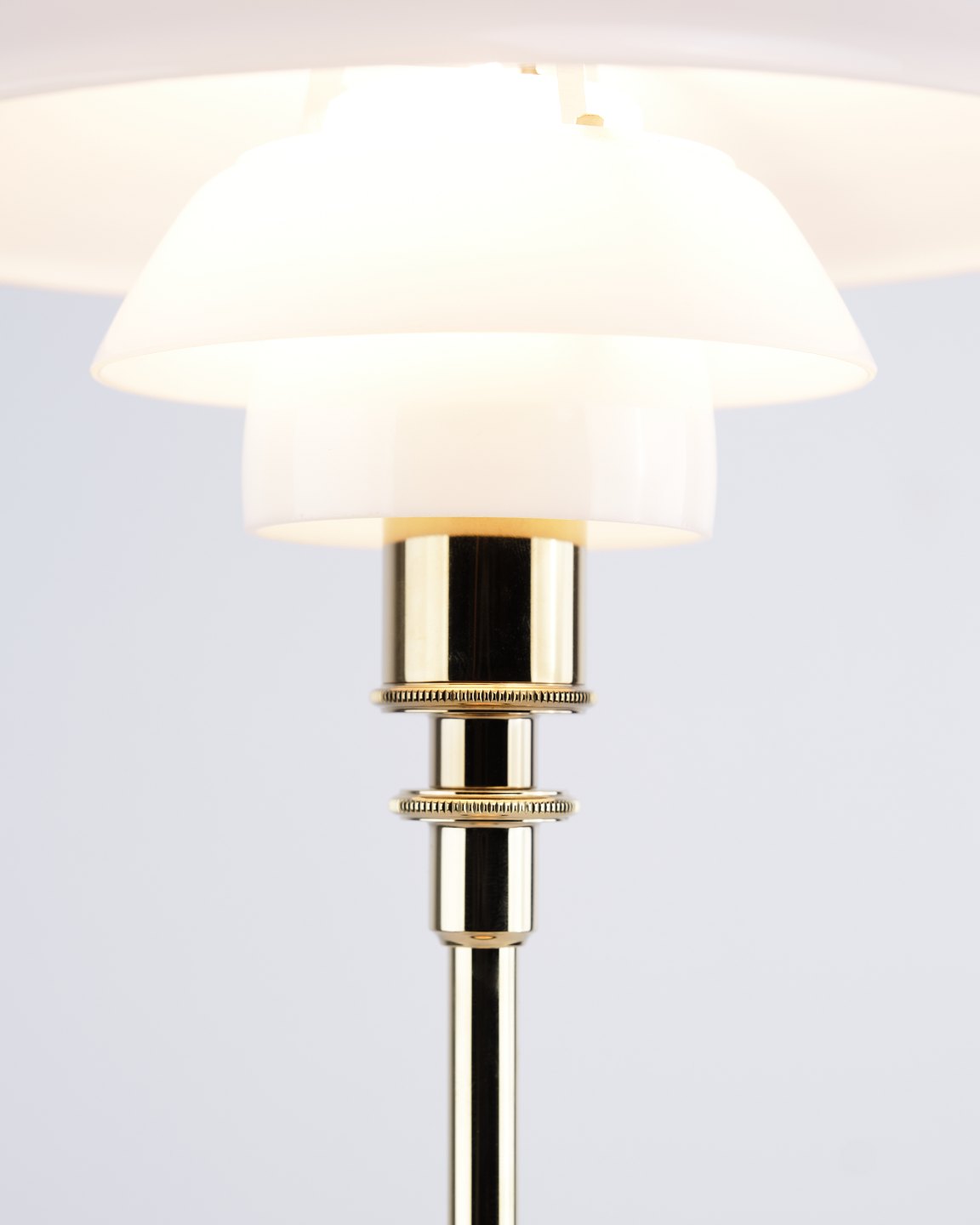PH 2/1 bordlampe designet af Poul Henningsen og introduceret i denne version af Louis Poulsen i 2019. Lampen er udført med fod i messing og skærme i hvidt opalglas, som giver et blødt og behageligt lys. Det ikoniske treskærmssystem er udviklet til at sikre optimal lysfordeling og minimere blænding.— Oprindelse: Danmark