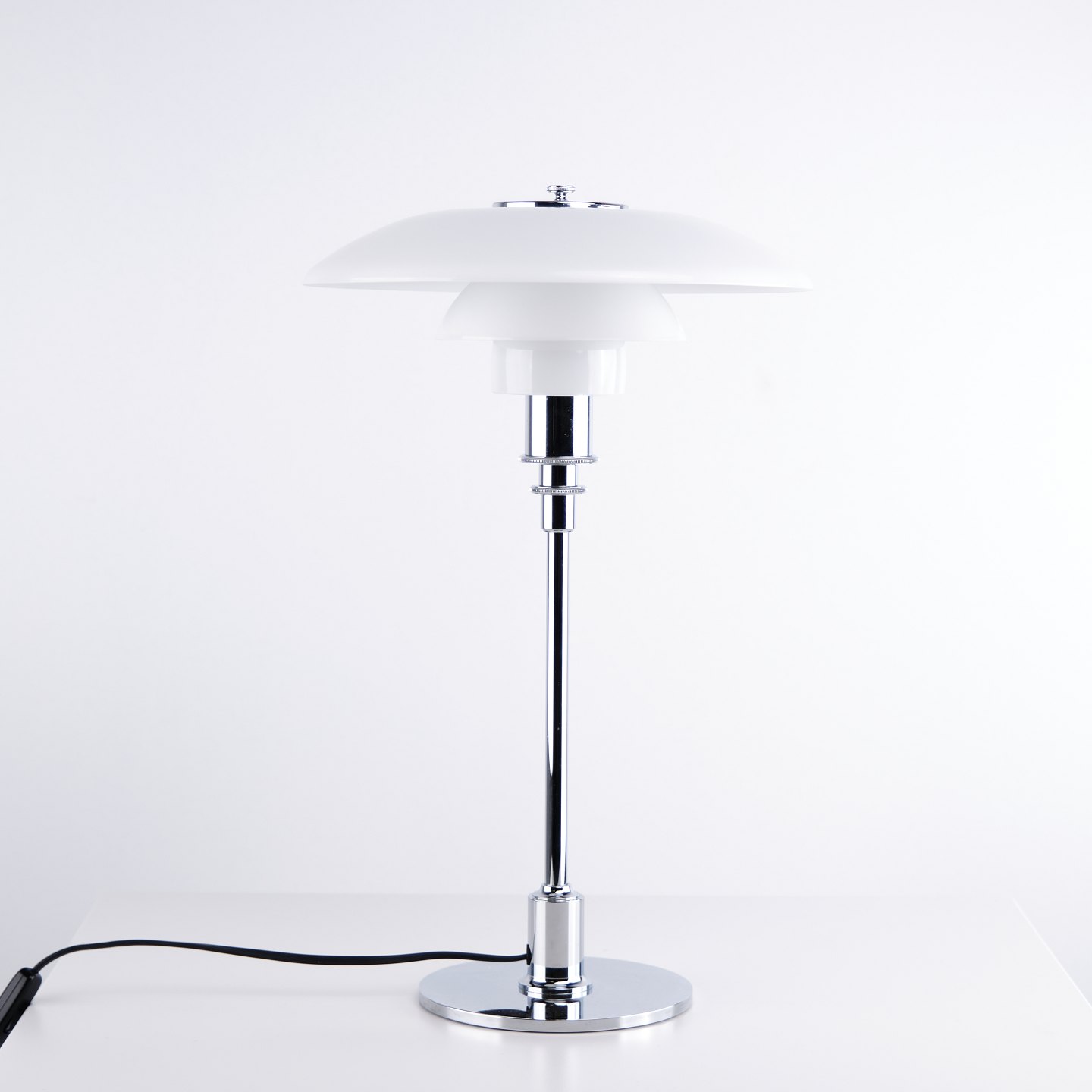 PH 3/2 bordlampe designet af Poul Henningsen og fremstillet af Louis Poulsen. Lampen er udført med skærme i hvidt opalglas, som sikrer et blødt og blændfrit lys. Det ikoniske treskærmssystem er udviklet for optimal lysfordeling og er et centralt element i Henningsens designfilosofi.— Oprindelse: Danmark