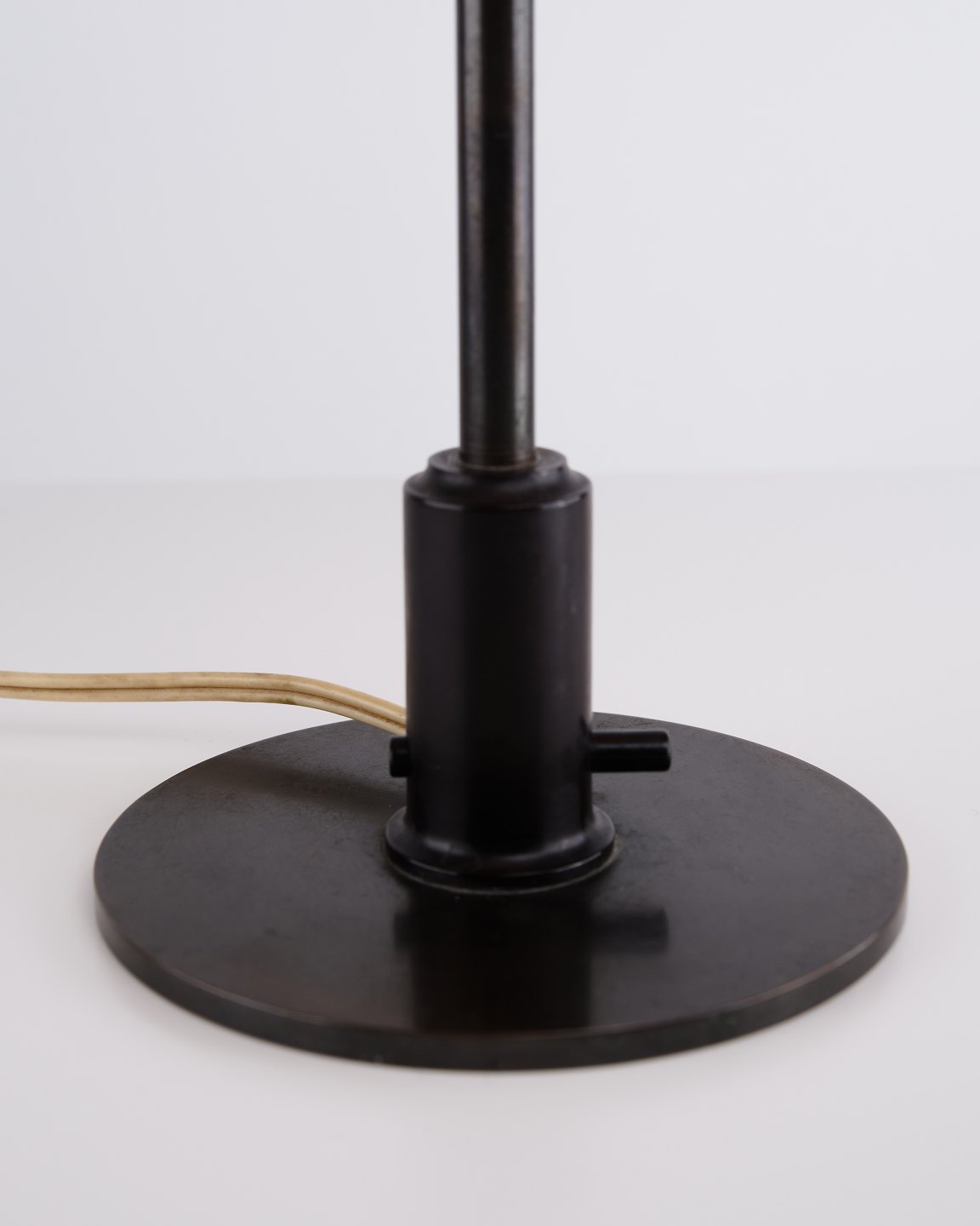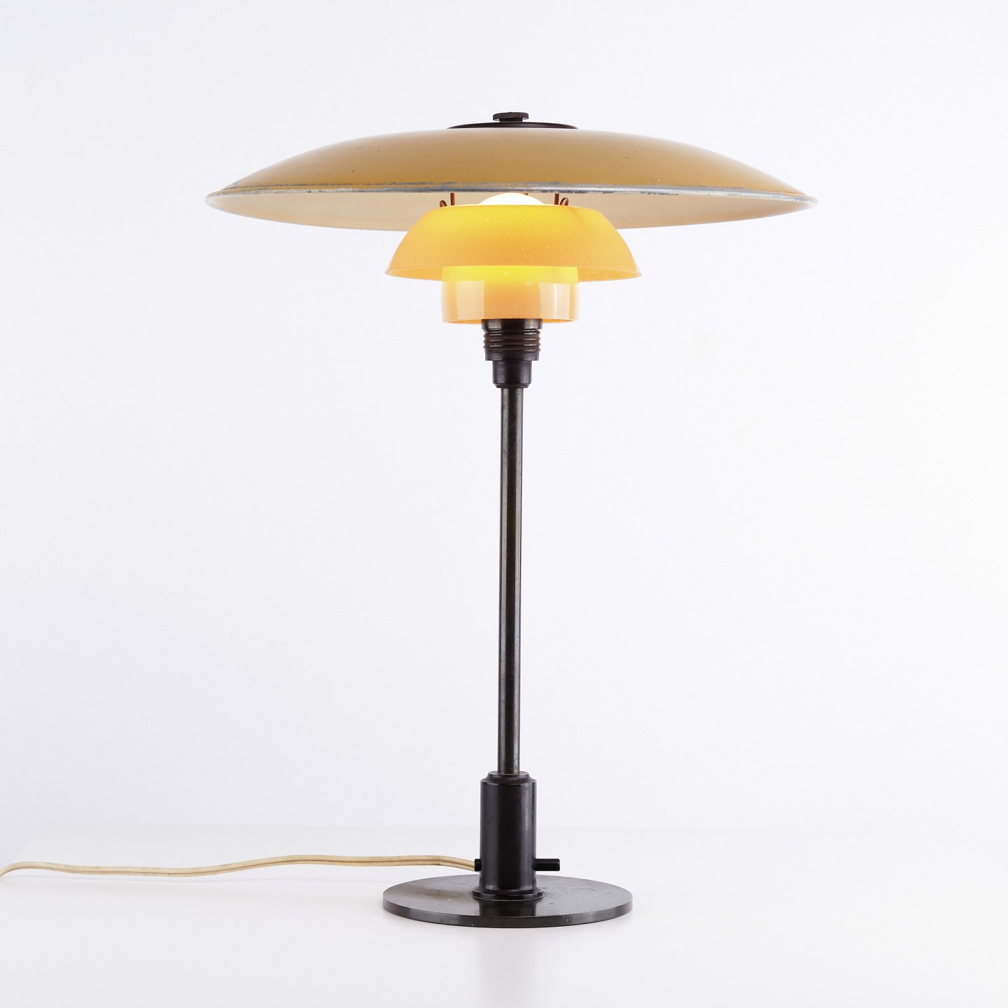 Sjælden PH 3,5/2,5 bordlampe designet af Poul Henningsen og fremstillet af Louis Poulsen i 1930’erne. Lampen har gulmalet metaloverskærm med stel i bruneret messing samt mellem- og bundskærme i 1-lags gulmalet opalglas.— Oprindelse: Danmark