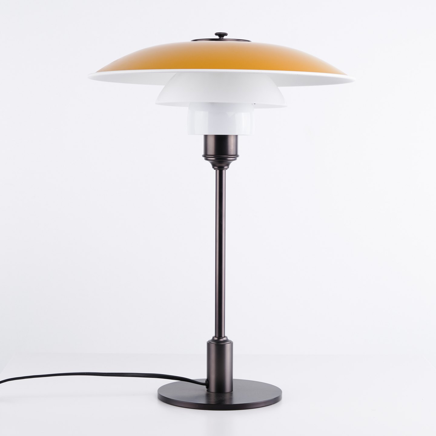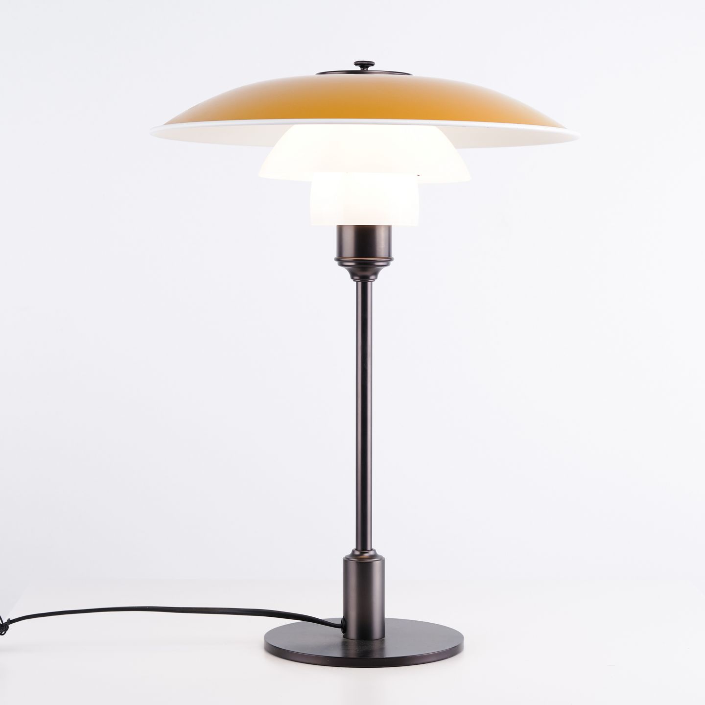 PH 3½-2½ bordlampe fra Louis Poulsen designet af Poul Henningsen i gul metal og bruneret messing. Klassisk dansk belysningsdesign.— Oprindelse: Danmark