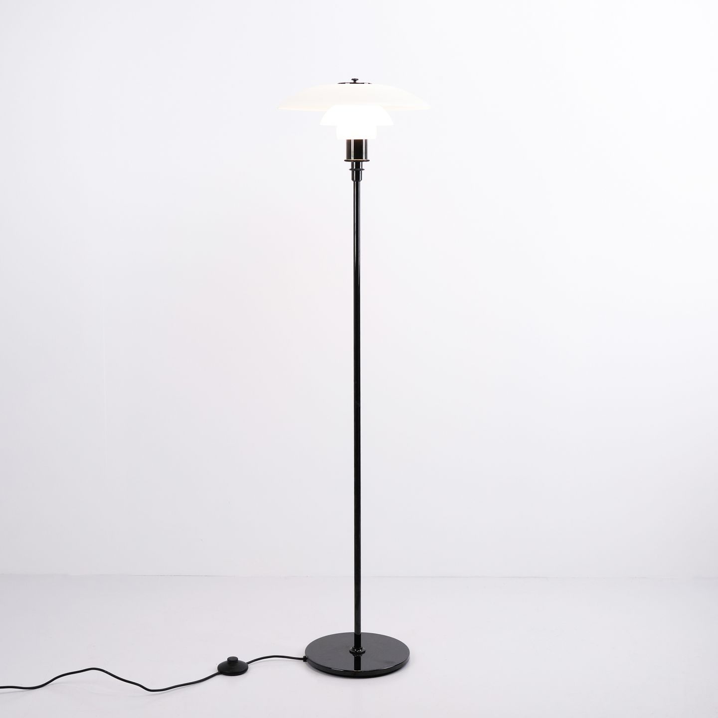 PH 3,5/2,5 gulvlampe designet af Poul Henningsen og fremstillet af Louis Poulsen. Lampen er udført med sort stel og skærme i hvidt opalglas, hvilket giver et elegant og balanceret udtryk. Det ikoniske treskærmssystem sikrer et blødt, blændfrit lys og en jævn lysfordeling.— Oprindelse: Danmark