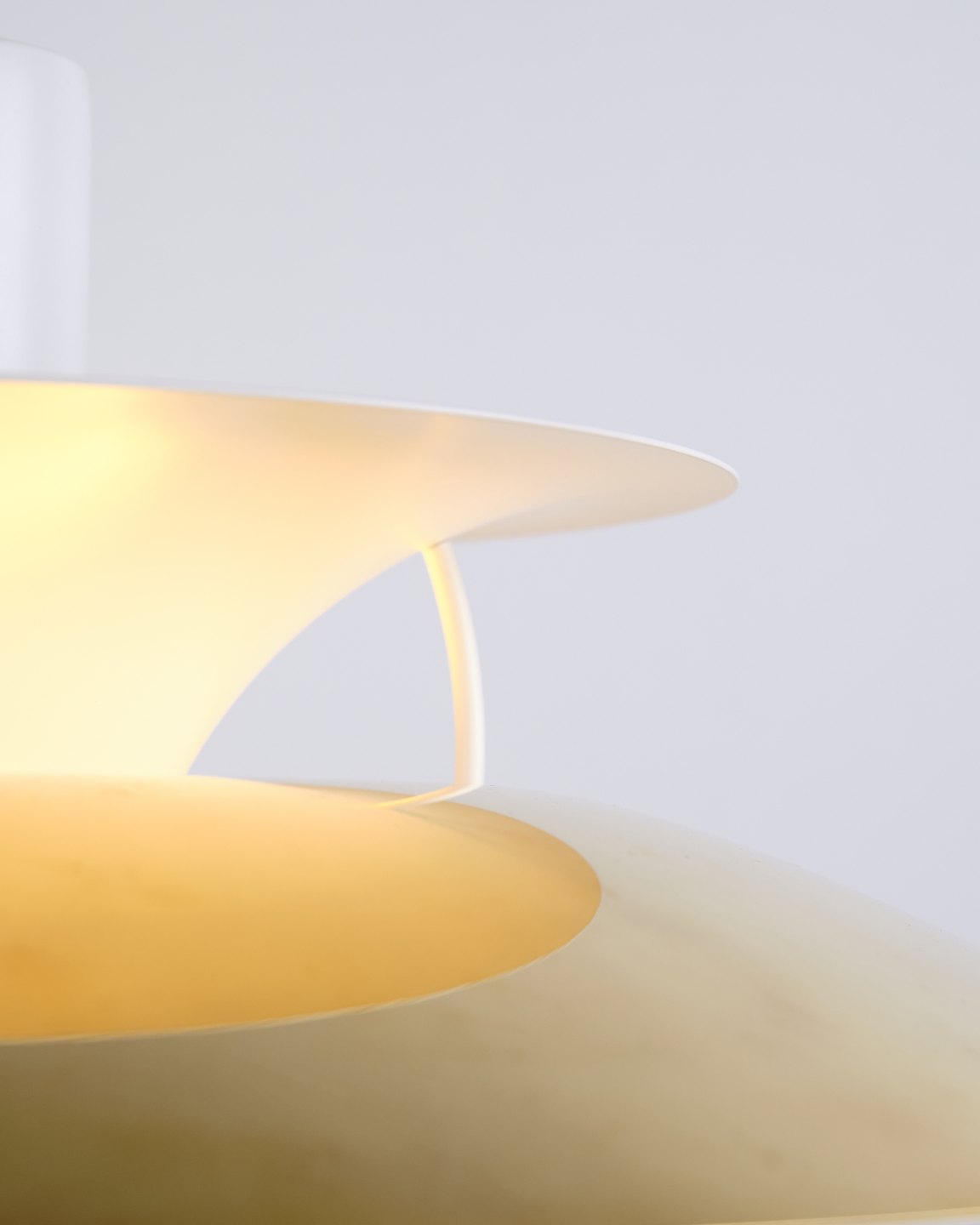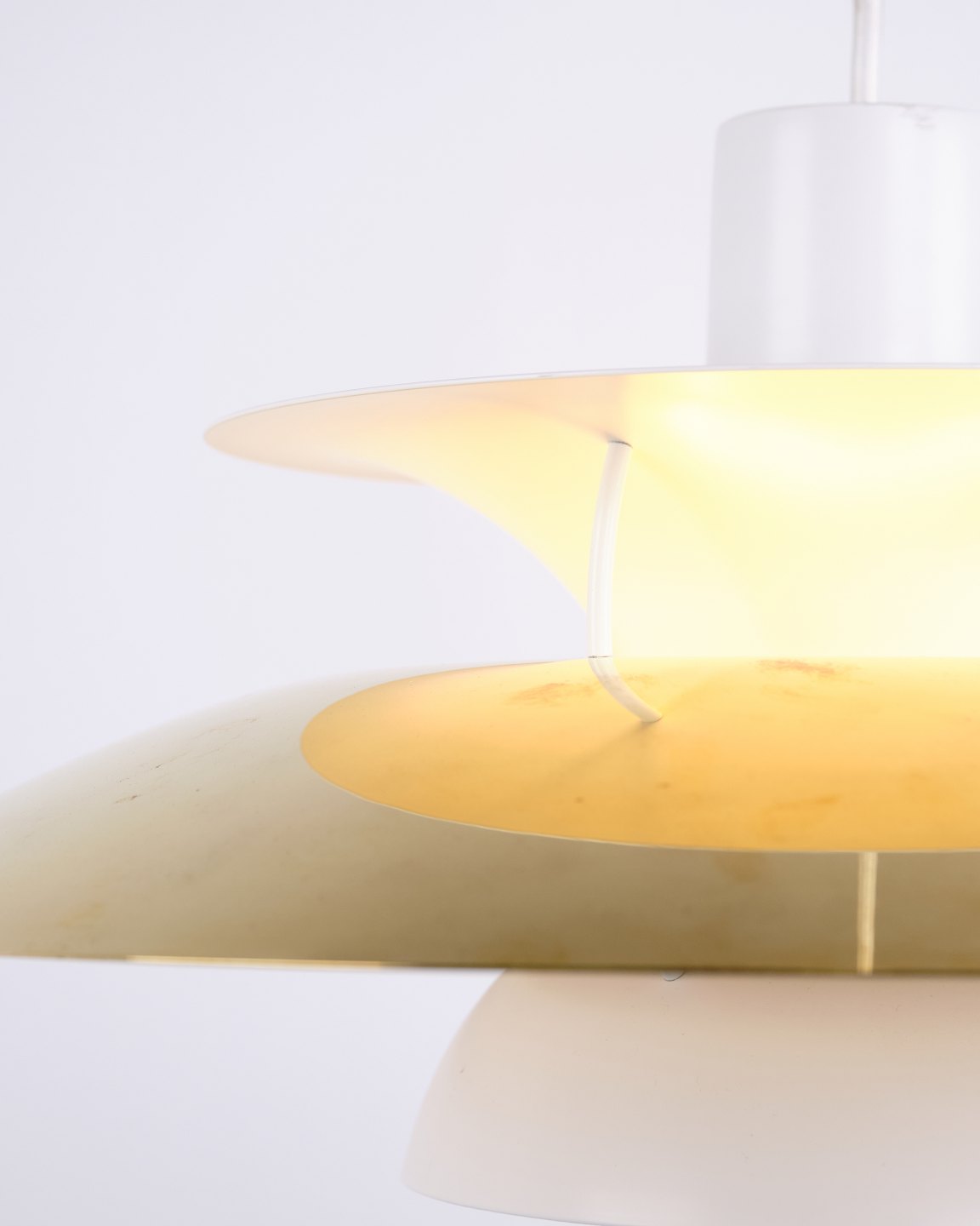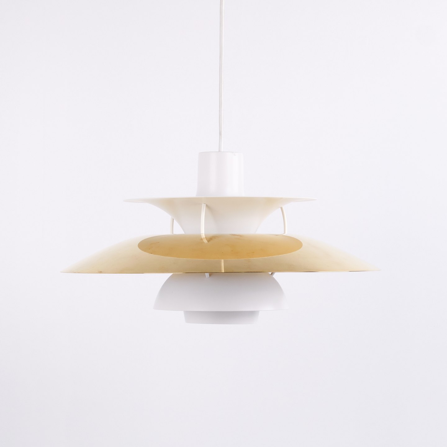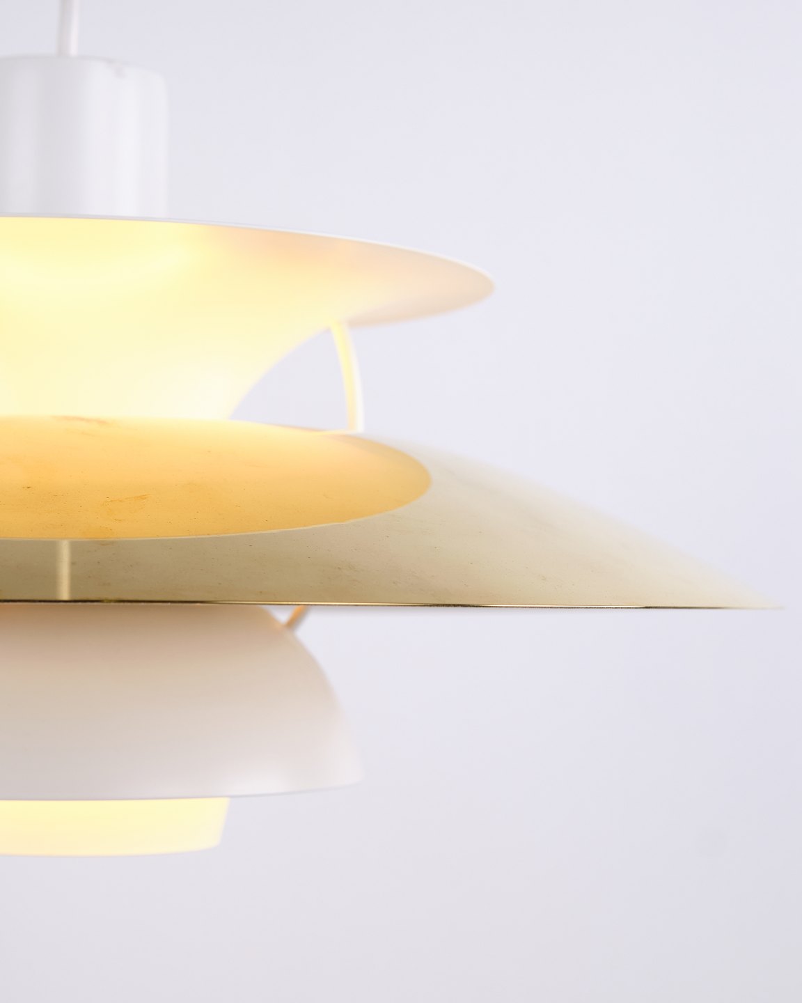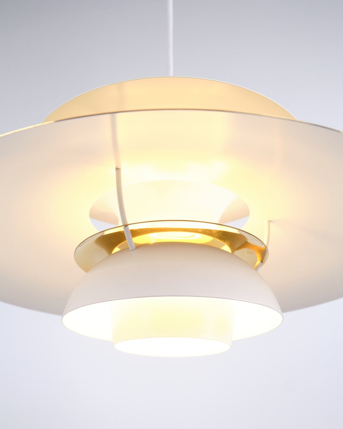 PH 5 pendel i messing fra Louis Poulsen designet af Poul Henningsen. Klassisk dansk lampe med blændfrit og funktionelt lys.— Oprindelse: Danmark