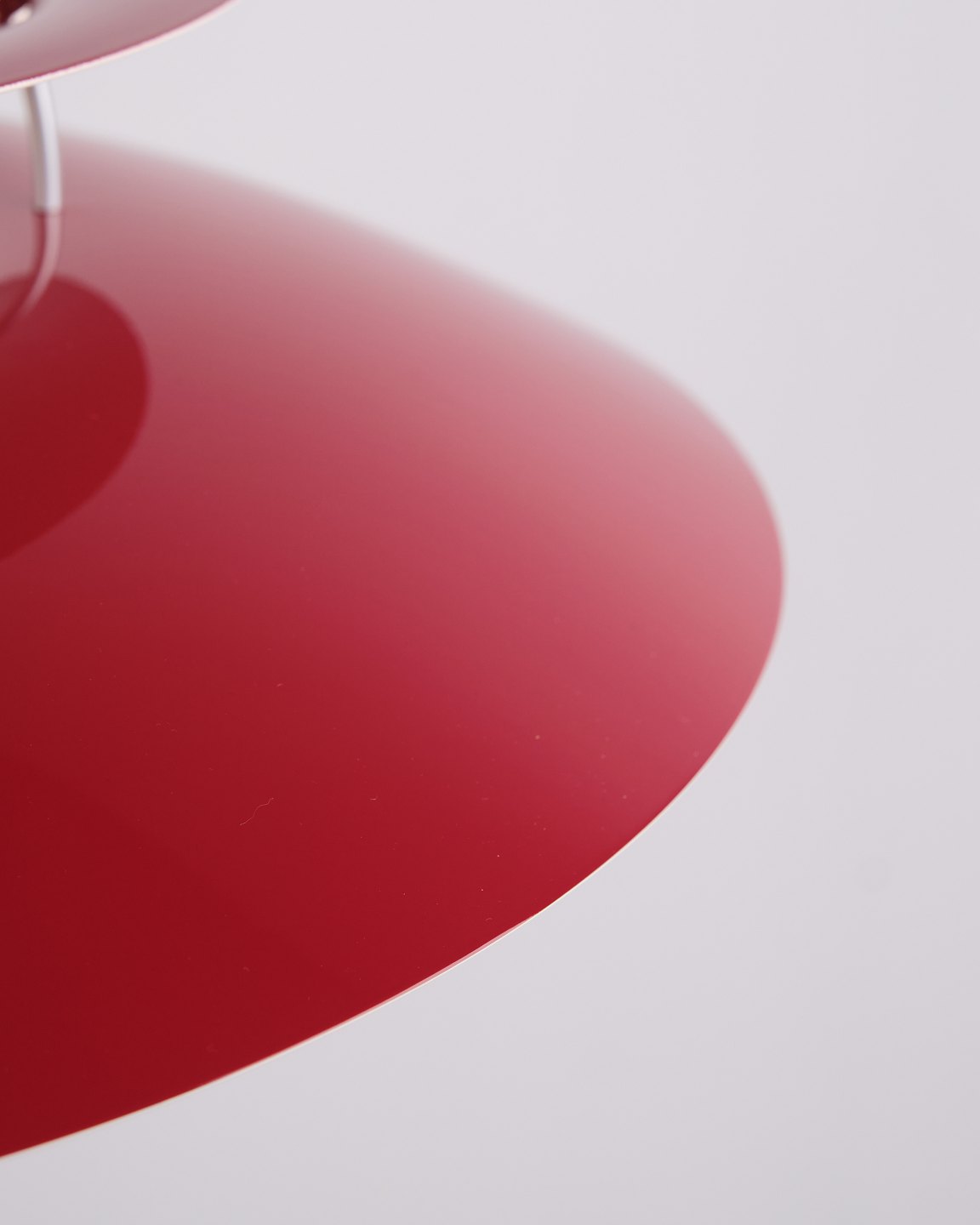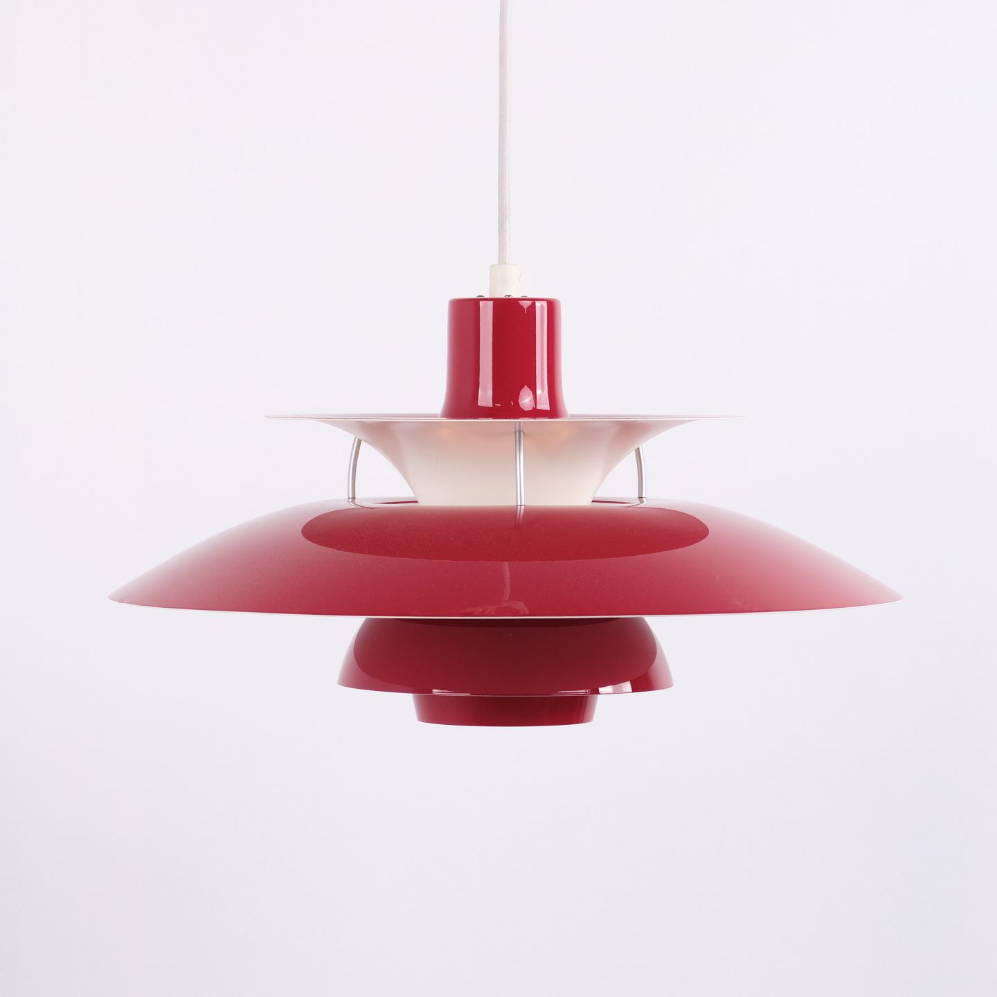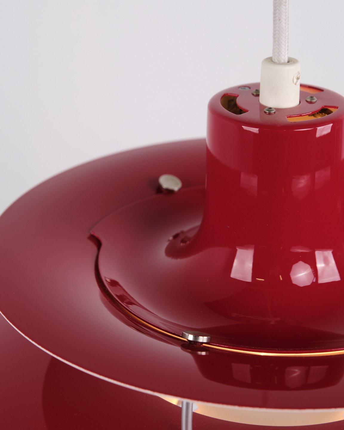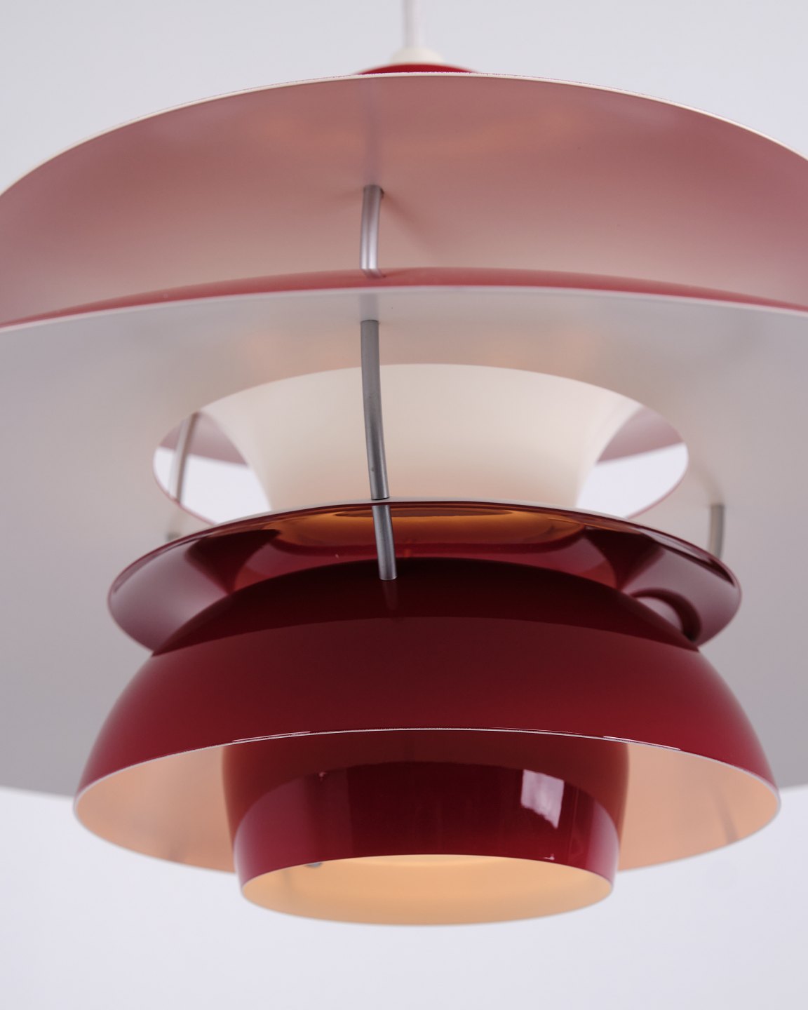 PH 5 pendel i rødlakeret metal fra Louis Poulsen designet af Poul Henningsen. Klassisk dansk lampe med blændfrit og funktionelt lys.— Oprindelse: Danmark