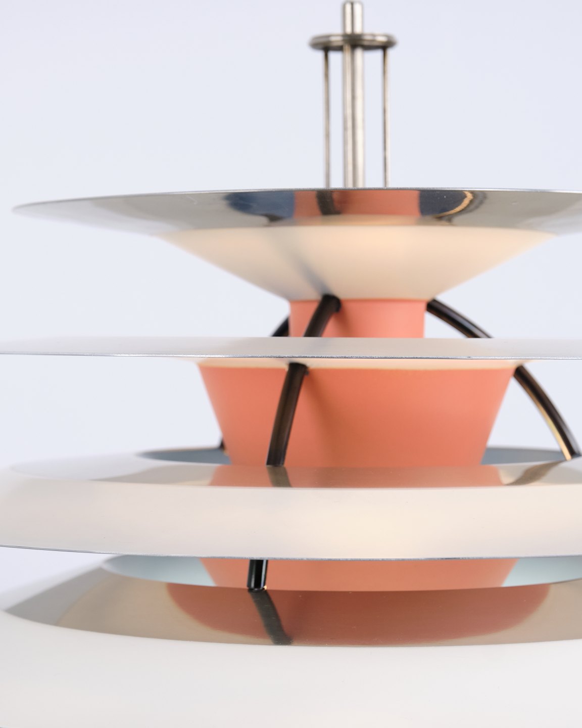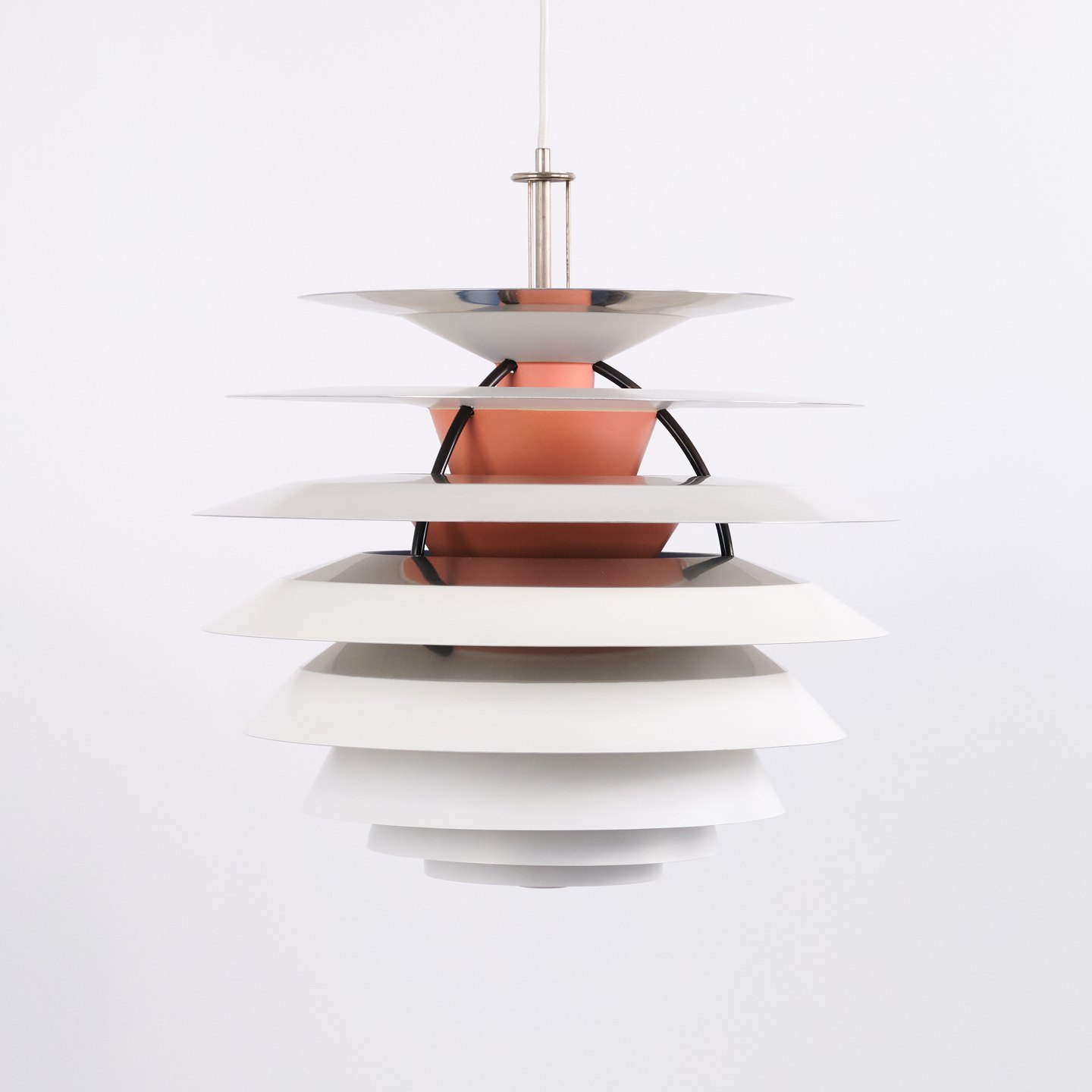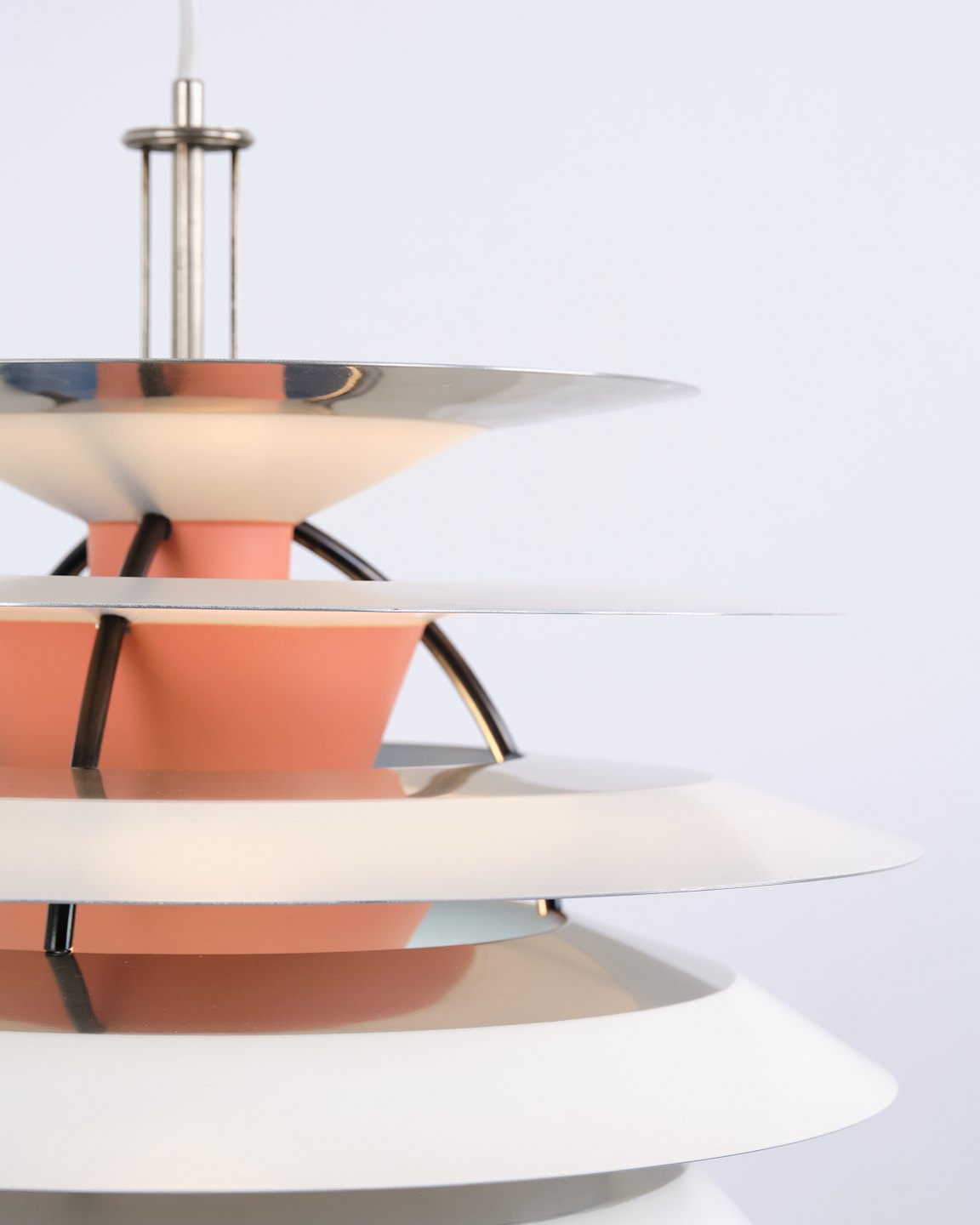 PH Kontrast pendel designet af Poul Henningsen og fremstillet af Louis Poulsen i 1980’erne. Lampen er opbygget med flere modsatrettede skærme, som skaber et dynamisk lys- og skyggeforløb. Konstruktionen giver et blødt, indirekte lys samtidig med, at lampen fremstår skulpturel i sit udtryk.— Oprindelse: Danmark