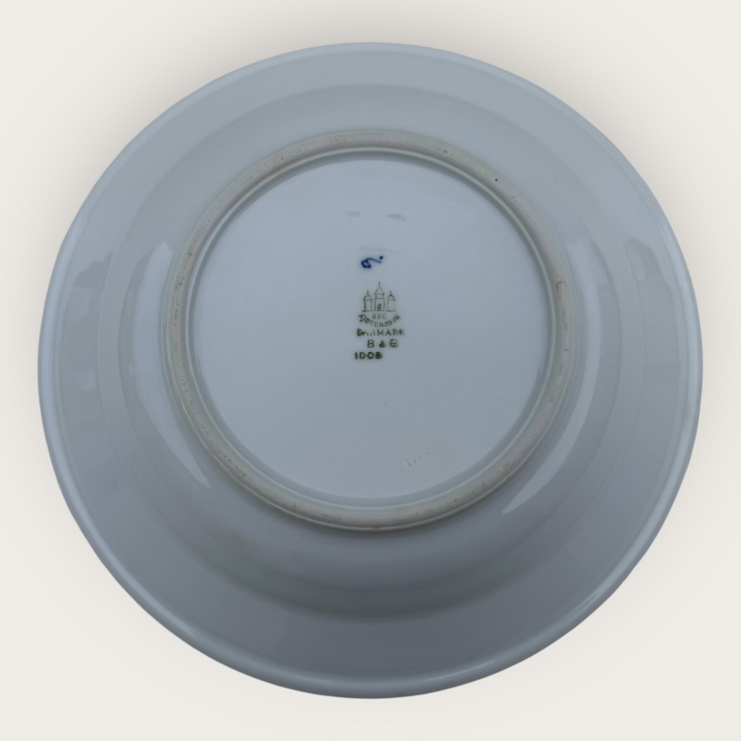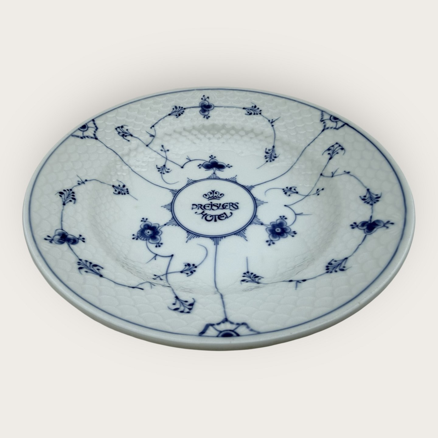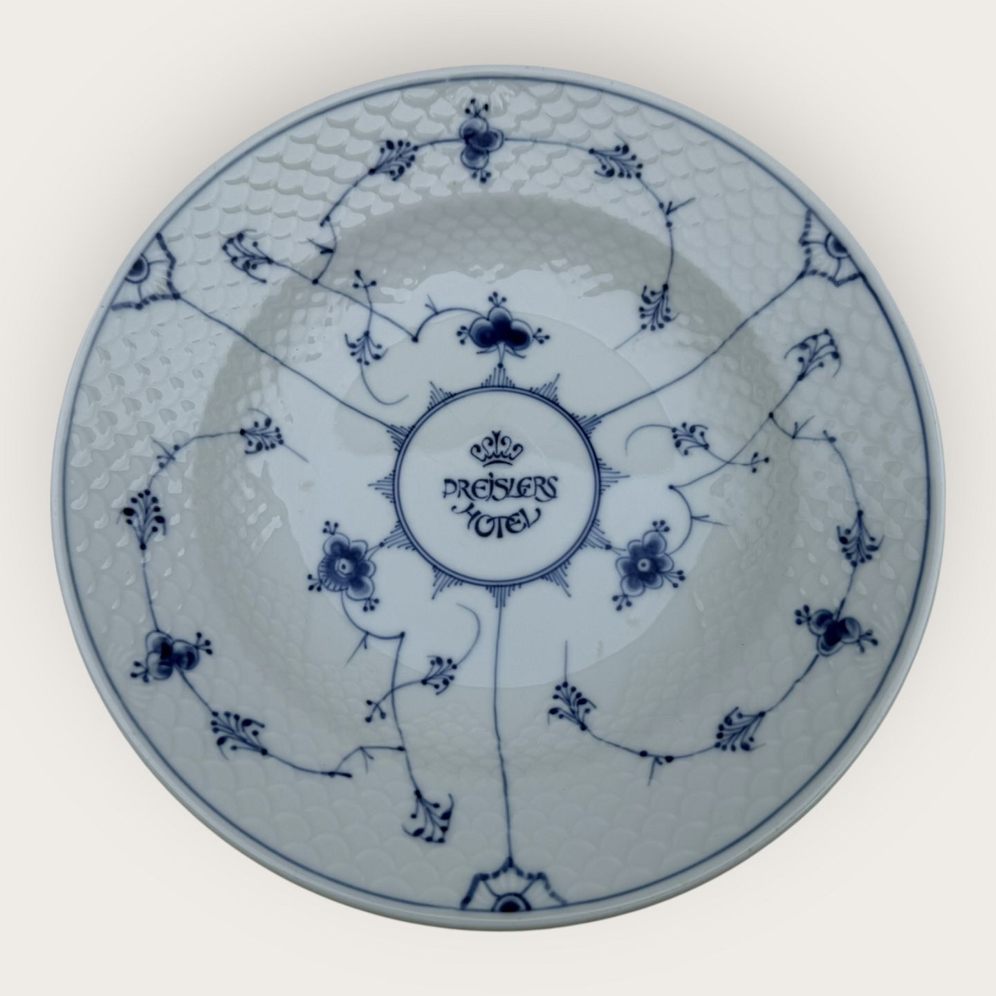 Bing & Grøndahl, Blå malet (Musselmalet), #1008, stor dyb tallerken i hotelporcelæn ( Jernporcelæn ) med logo fra Preislers Hotel, 25cm i diameter, 1. sortering * Pæn stand*Lager: 6