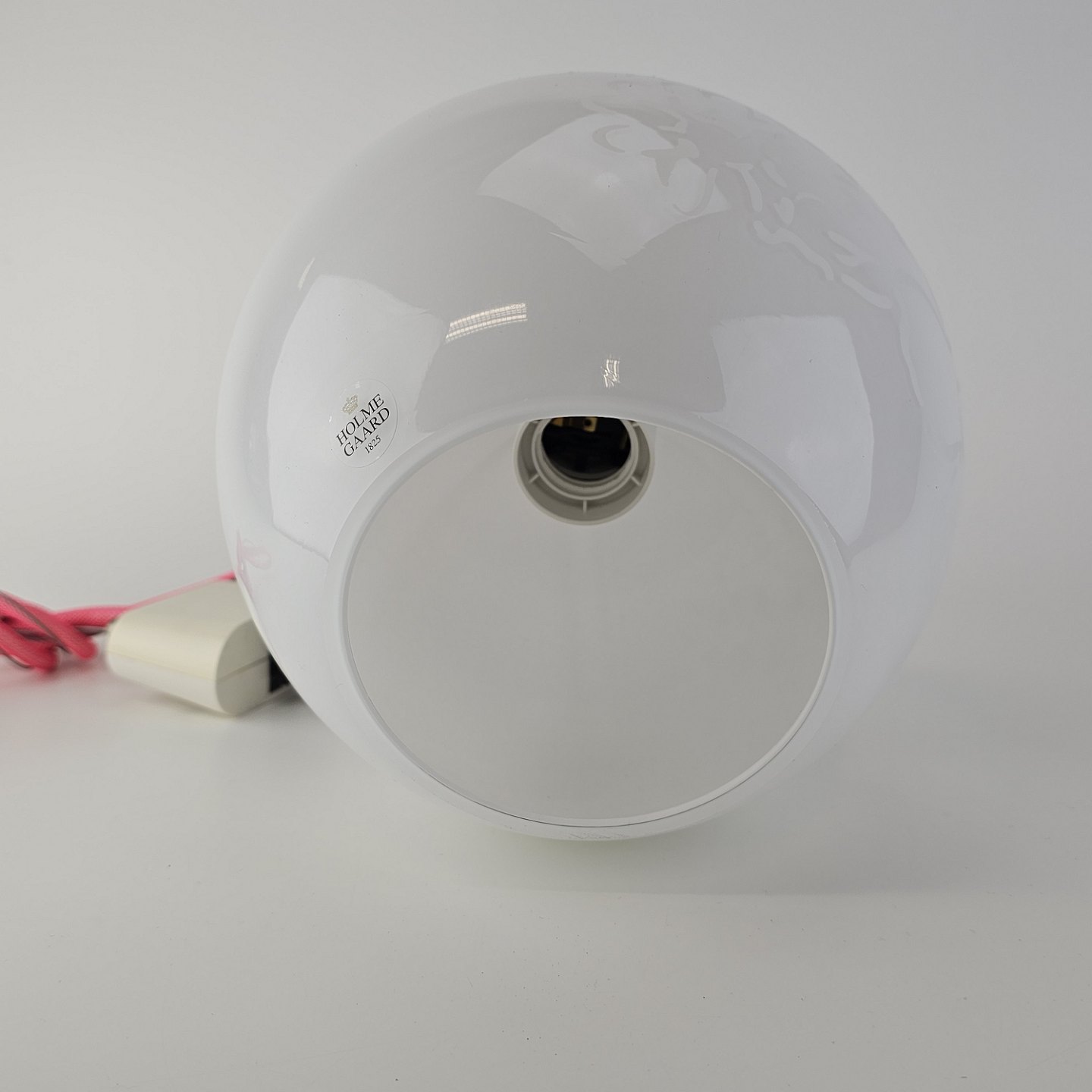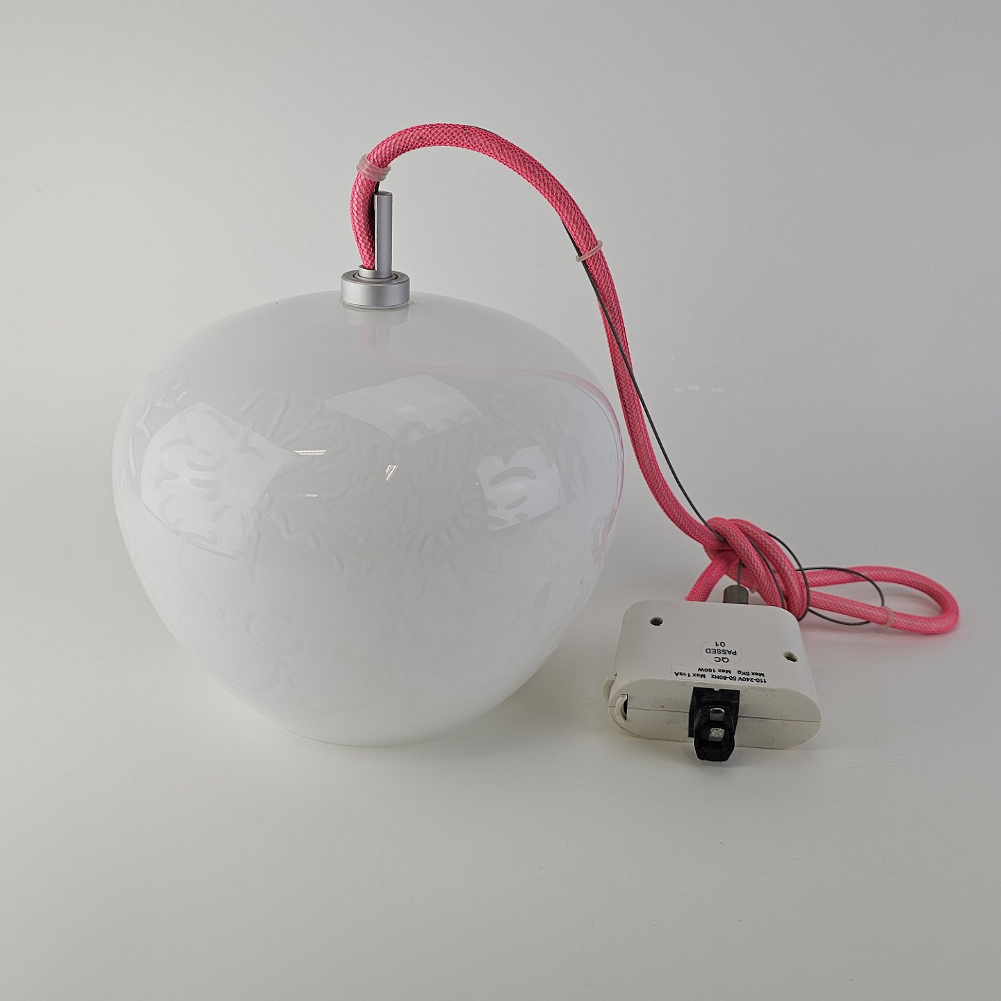 Pendel i hvidt mundblæst glas med blomstermotiver og monteret med lyserød ledningModel Organics