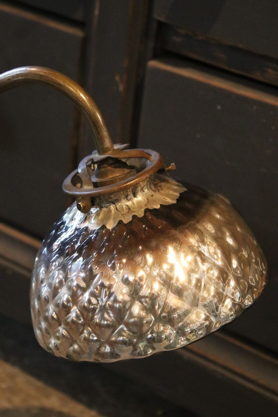 Gammel fransk Bureau bordlampe i krom med original lampeskærm i vaflet fattigmandssølv med en rigtig fin patina.Højde : 51,5cm. Lampeskærm Dia.: 15,5cm.