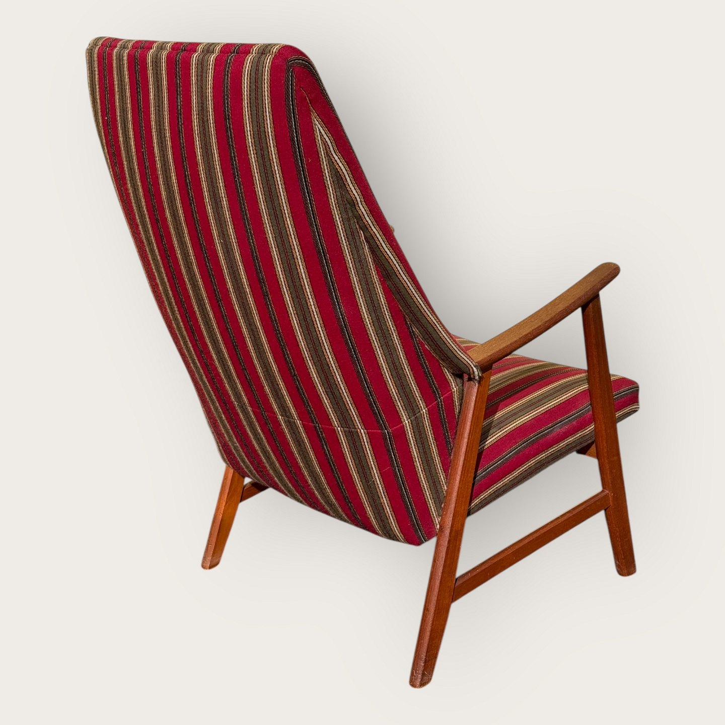 Lænestol i teaktræ og stof, sædehøjde 36cm, bredde 62cm, ryglæn højde 103cm, scandinavian modern fra 1960'erne *pæn stand*Lager: 1