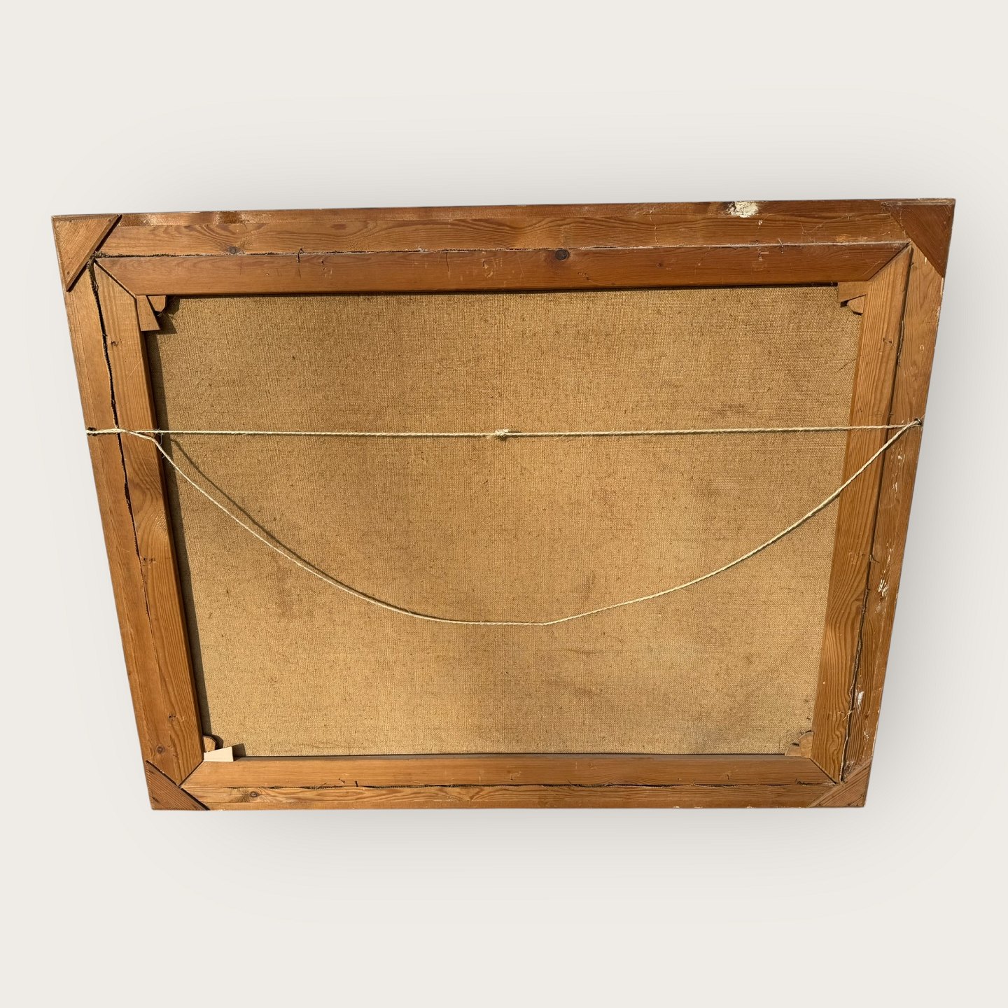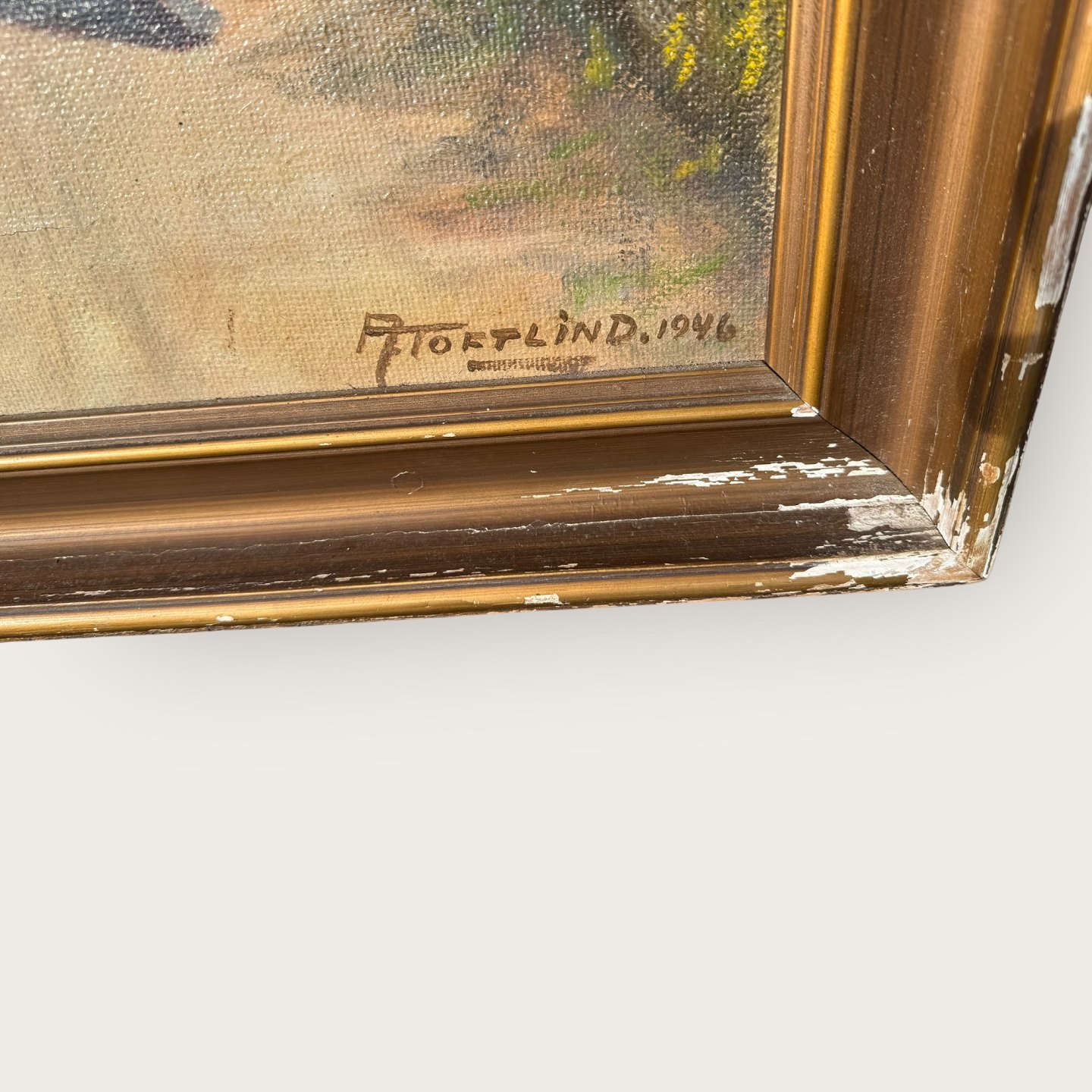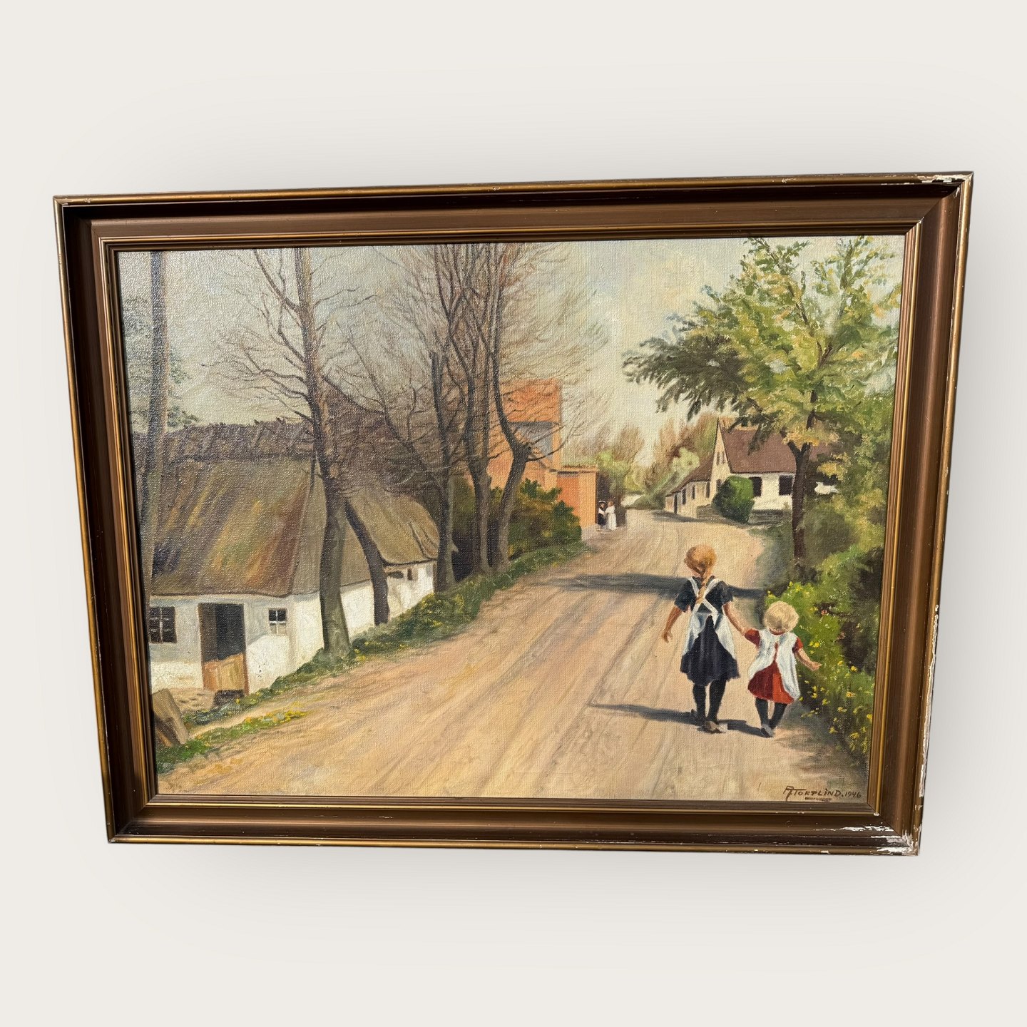 A. Toftlind, Piger på en vej, oliemaleri på lærred, lidt afskalninger på billedrammen ellers pæn stand, Mål med ramme: 110x85cmLager: 1