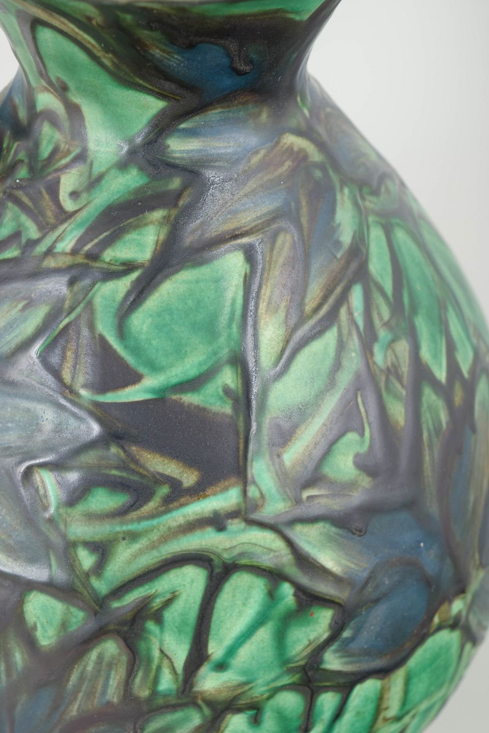 Kähler, vase med kohornsglasur.Stor vase i glaseret lertøj med balusterform og smal hals. Udført i den karakteristiske kohornsglasur med dybe grønne, blå og mørke nuancer, hvor glasuren flyder i organiske mønstre og skaber et dramatisk og levende overfladespil.