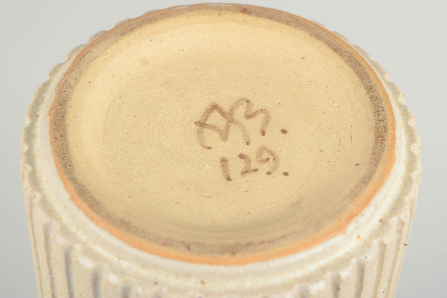 Arne Bang, marmeladekrukke med låg og ske.Hånddrejet cylindrisk stentøjskrukke med lodret riflet korpus og lys, mat glasur. Monteret med låg i sterlingsølv samt ske fra Georg Jensen, i det klassiske dronninge-mønster, udført i 1940’erne.