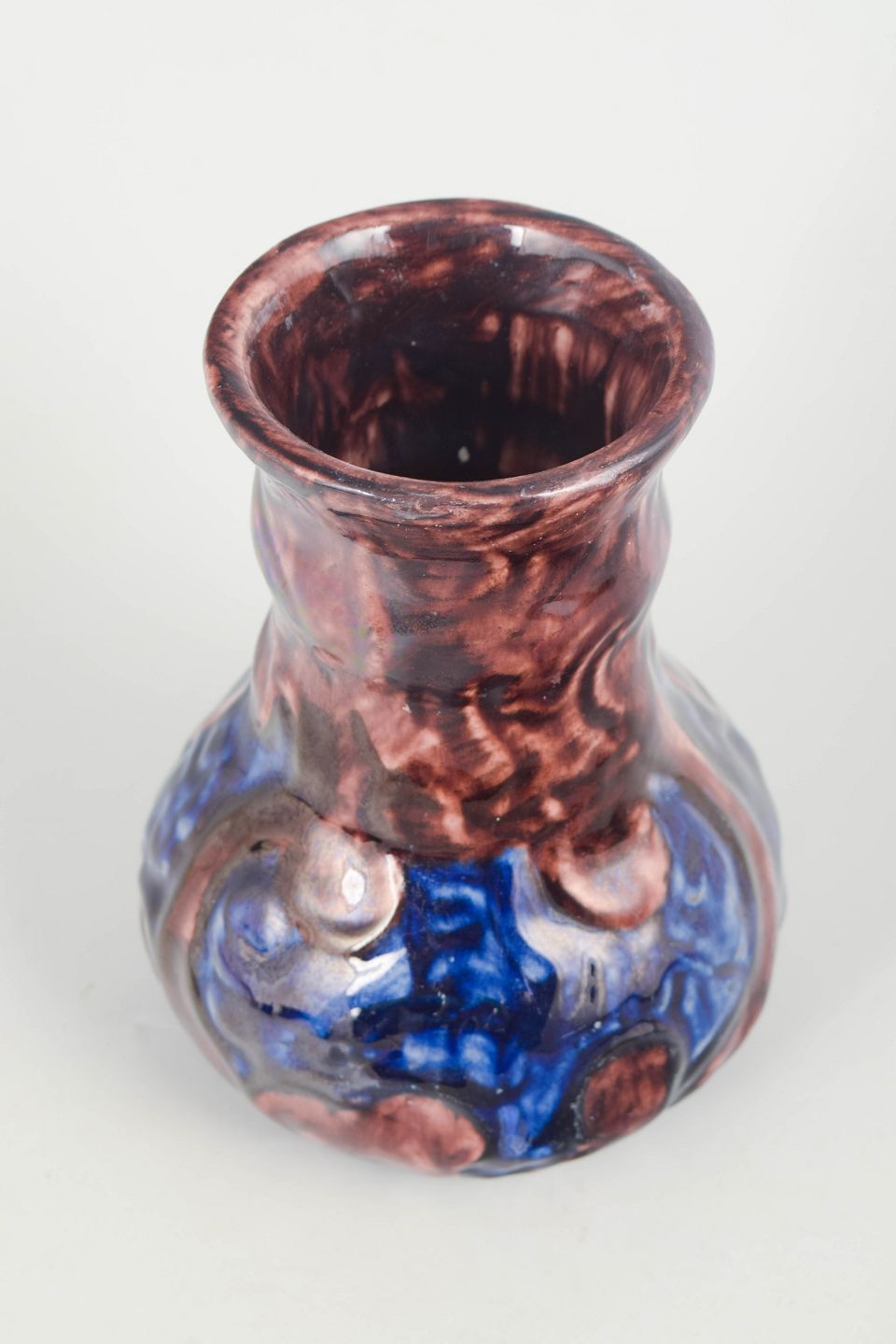 Roskilde Lervarefabrik, vase med bølledekoration.Dekorativ vase i fajance med svungen, organisk form og let indsnævret hals. Udført med den karakteristiske bølledekoration i blå og brun glasur på lys bund. Signeret under bunden.