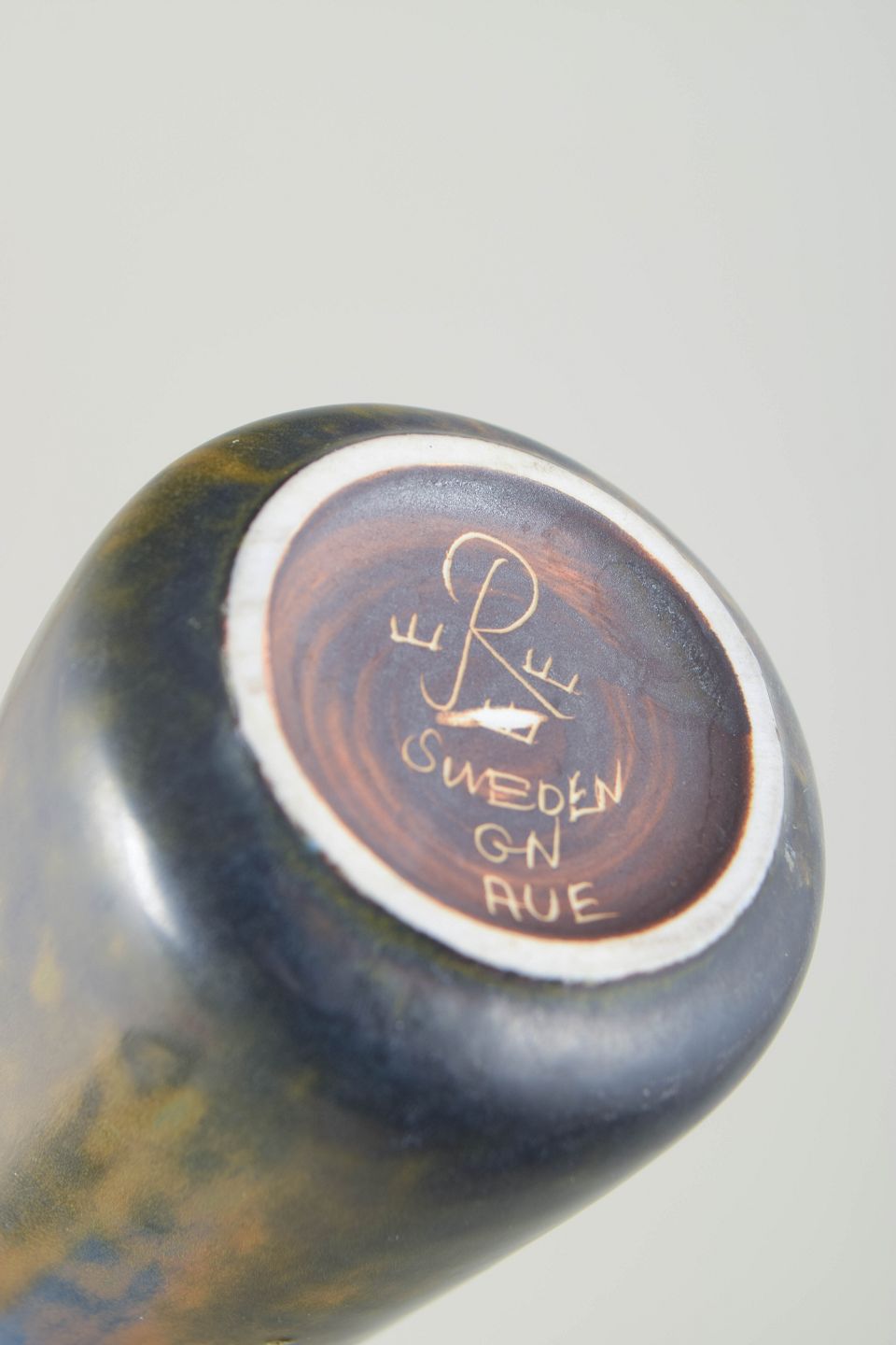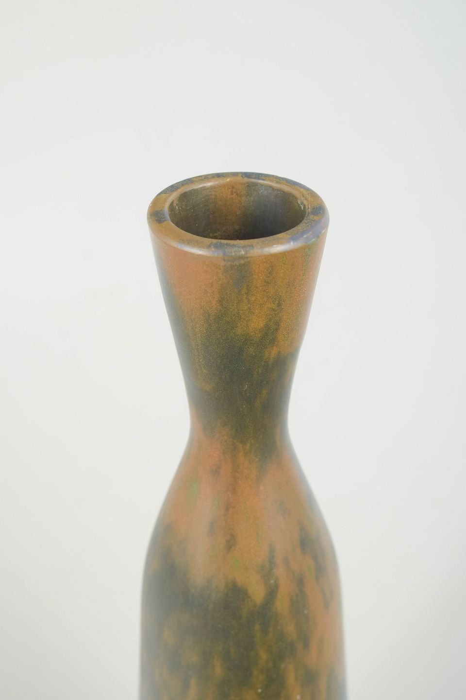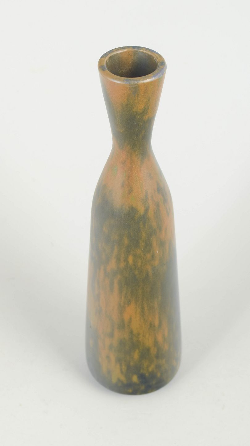 Gunnar Nylund for Rörstrand, vase.Slank vase i stentøj med høj, flaskeformet krop og smal hals. Dekoreret med flydende glasur i blågrønne og gyldenbrune nuancer, som giver et levende og organisk udtryk.