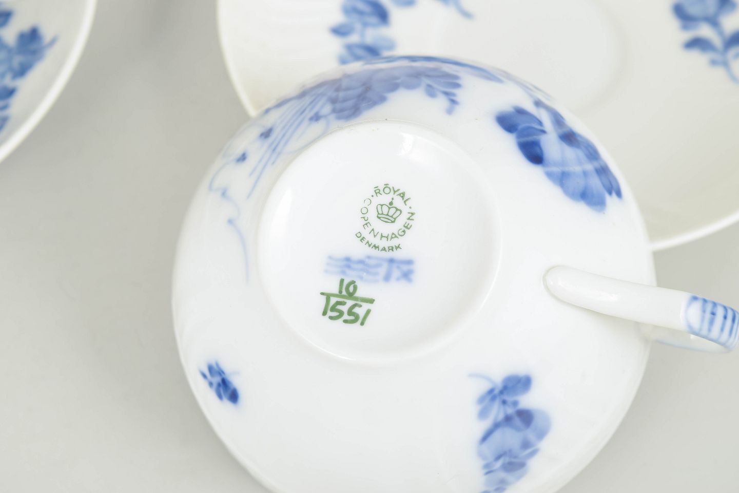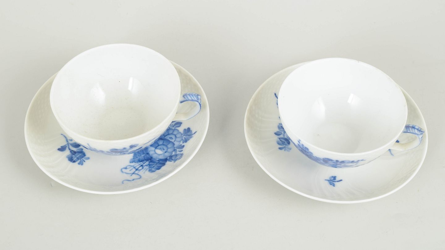 Royal Copenhagen, Blå Blomst Svejset sæt af to tekopper med tilhørende underkopper.Sæt bestående af to tekopper med matchende underkopper i porcelæn, dekoreret med håndmalet blå blomsterdekoration i relief. Modelnummer 10/1551, 1. sortering, fra 1990’erne.