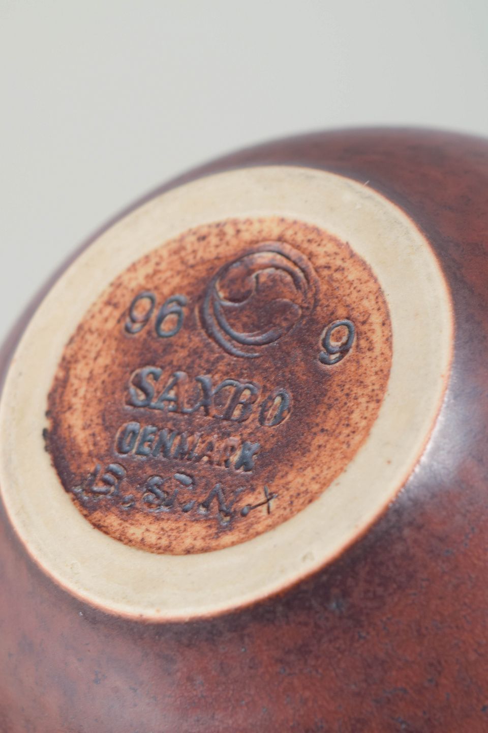 Eva Stæhr Nielsen for Saxbo, vase.Organisk formet vase i stentøj med rund korpus og smal hals, dekoreret med dyb rødbrun glasur med gyldne nuancer.
