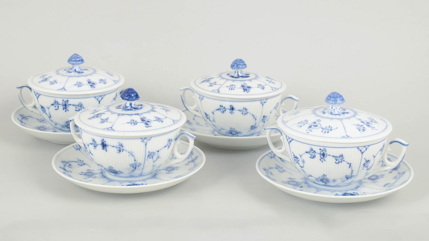 Royal Copenhagen, musselmalet riflet sæt af fire bouillonkopper med underkopper.Sæt af fire bouillonkopper i porcelæn med matchende underkopper, dekoreret i underglasur blå med klassisk musselmalet riflet mønster. Model 1/2199, 1. sortering, dateret 1966.