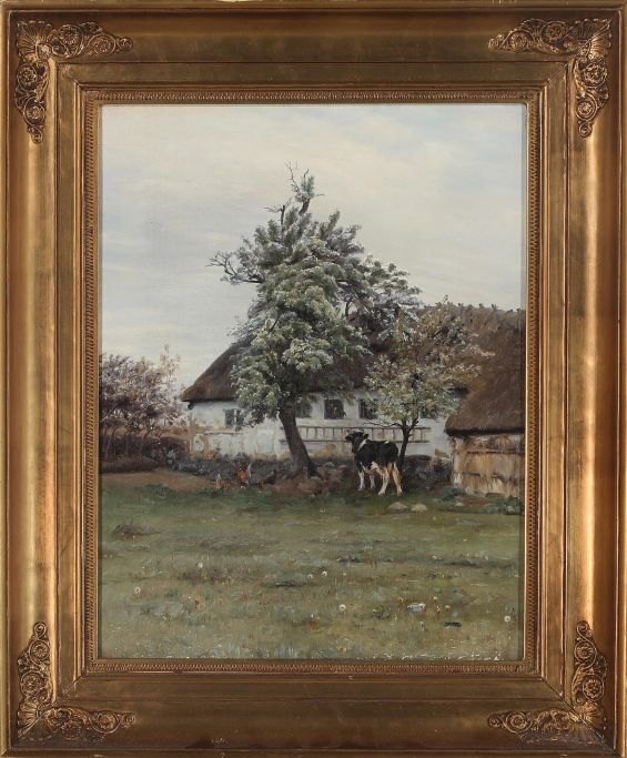 Mols, Niels Pedersen (1859 - 1921) Danmark: Parti fra en gård med høns og en ko. Signeret N. P. Mols, 88. Olie på lærred. 47,5 ×37,5 cm. Indrammet i en hjørnedekoreret Kleis ramme: 63 x 52 cm. Emne nummer: 29117