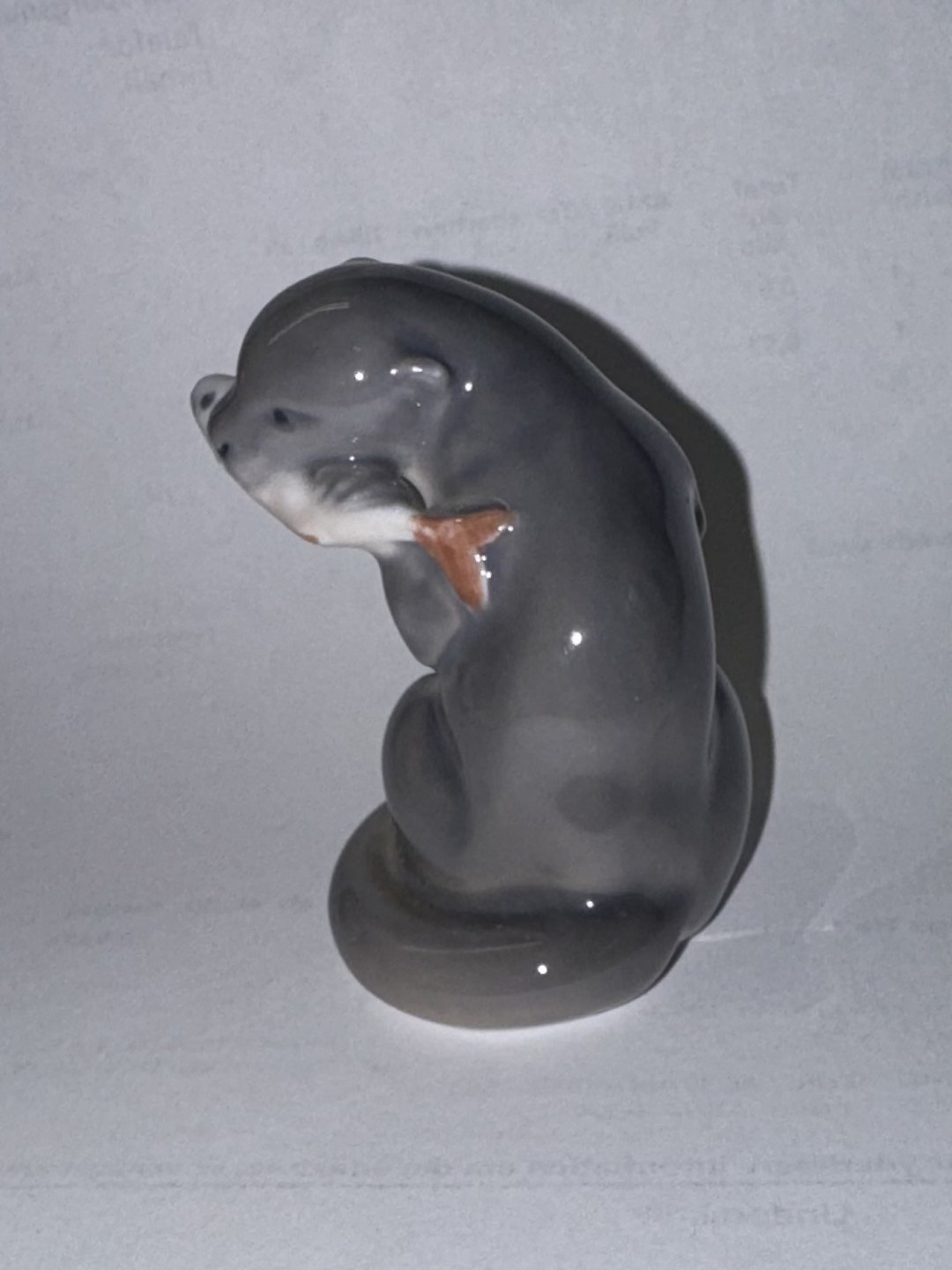 Figur i porcelæn af odder med fiskefangst i munden fra Royal Copenhagen. 2. Sortering. I god stand uden skader eller reparationer. Fabriksmærket samt Modelnummer 2333 på bunden. H. 5 cm